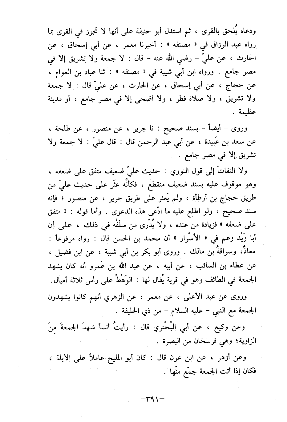 ولا التفاتَ إلى قول النووي: حديث علي ضعيف متفق على ضعفه، وهو موقوف عليه بسند ضعيف منقطع، فكأنَّه عثَر على حديث عليّ من طريق حجاج بن أرطأة، ولم يَعثر على طريق جرير، عن منصور؛ فإنه سند صحيح، ولو اطلع عليه ما ادعى هذه الدعوى. وأما قوله: " متفق على ضعفه " فزيادة من عنده، ولا يُدْرى من سلَفُه في ذلك، على أن أبا زَيْد زعم في" الا"سْرار " أن محمد بن الحسن قال: رواه مرفوعا: معاذ، وسراقةُ بن مالك. وروى أبو بكر بن أبي شيبة، عن ابن فضيل، عن عطاء بن السائب، عن أبيه، عن عبد الله بن عَمرو ابنه كان يشهد الجمعة في الطائف وهو في قرية يُقال لها: الوَهْطُ على رأس ثلاثة أميال. وروى عن عبد الأعلى، عن معمر، عن الزهري أنهم كانوا يشهدون الجمعة مع النبي- عليه السلام- من ذي الحليفة.