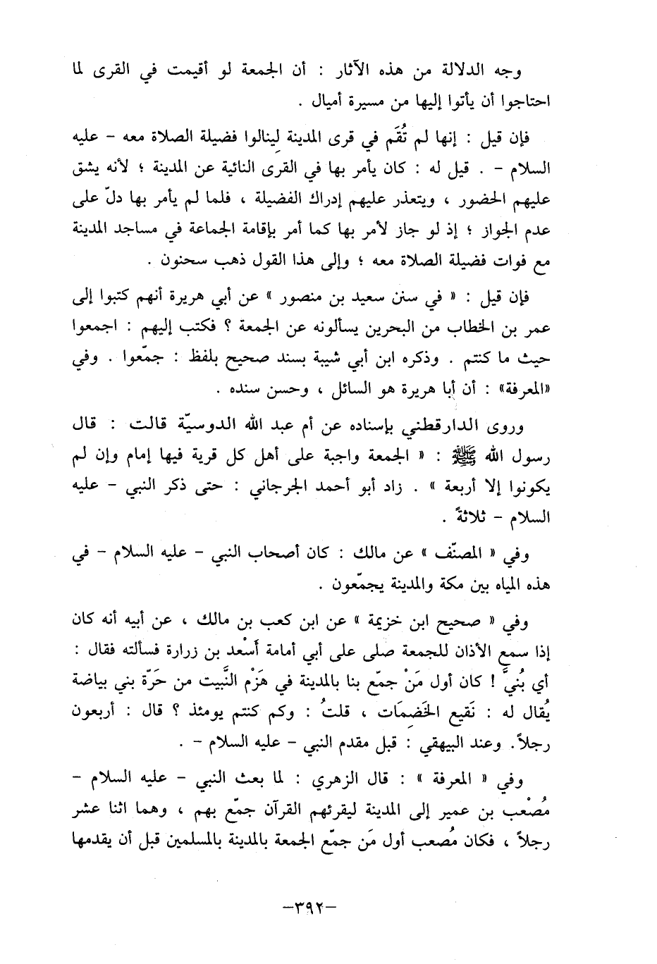 فإن قيل: إنها لم تُقَم في قرى المدينة لينالوا فضيلة الصلاة معه- عليه السلام-. قيل له: كان يأمر بها في القرَى النائية عن المدينة؛ لأنه يشق عليهم الحضور، ويتعذر عليهم إدراك الفضيلة، فلما لم يأمر بها دل على عدم الجواز؛ إذ لو جاز لأمر بها كما أمر بإقامة الجماعة في مساجد المدينة مع فوات فضيلة الصلاة معه؛ وإلى هذا القول ذهب سحنون.