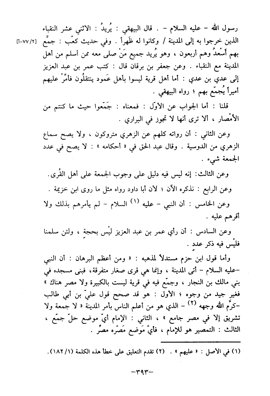 - عليه السلام- أتى المدينة، وإنما هي قرى صغار متفرقة، فبنى مسجده في بني مالك بن النجار، وجمع فيه في قرية ليست بالكبيرة ولا مصر هناك فغير جيد من وجوه؛ الأول: هو قد صحح قول علي بن أبي طالب - كرم الله وجهه (2) - الذي هو من أعلم الناس بأمر المدينة " لا جمعة ولا تشريق إلا في مصر جامع "، الثاني: الإمام أيّ موضع حل جمع، الثالث: التمصير هو للإمام، فأقي مَوضع مَصره مصر.
