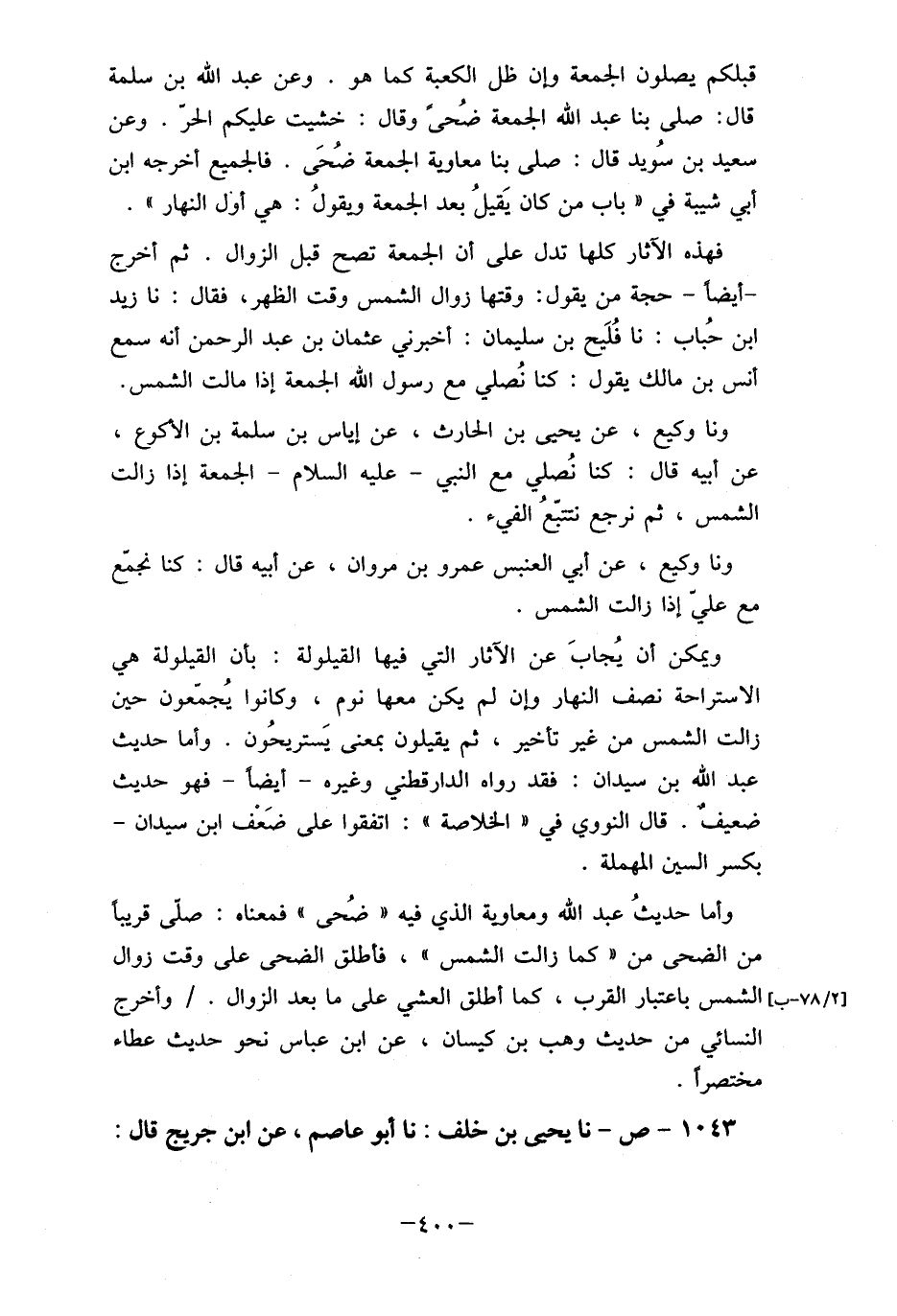 قبلكم يصلون الجمعة وإن ظل الكعبة كما هو. وعن عبد الله بن سلمة قال: صلى بنا عبد الله الجمعة ضُحىً وقال: خشيت عليكم الحر. وعن سعيد بن سُويد قال: صلى بنا معاوية الجمعة ضُحَى. فالجميع أخرجه ابن أبي شيبة في " باب من كان يَقيلُ بعد الجمعة ويقولُ: هي أول النهار ". فهذه الآثار كلها تدل على أن الجمعة تصح قبل الزوال. ثم أخرج