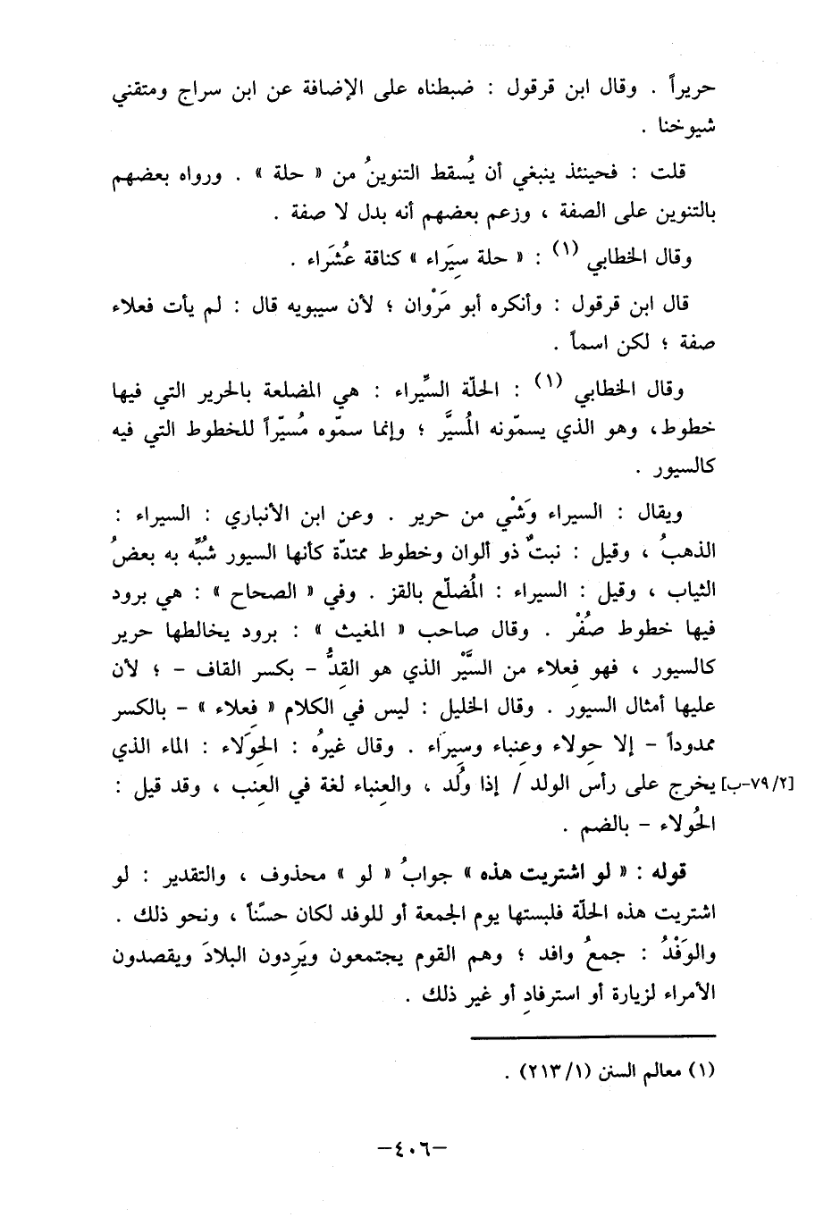 وقال الخطابي (1) : الحلّة السيراء: هي المضلعة بالحرير التي فيها خطوط، وهو الذي يسقونه المُسير؛ وإنما سقوه مُسيّراً للخطوط التي فيه كالسيور.