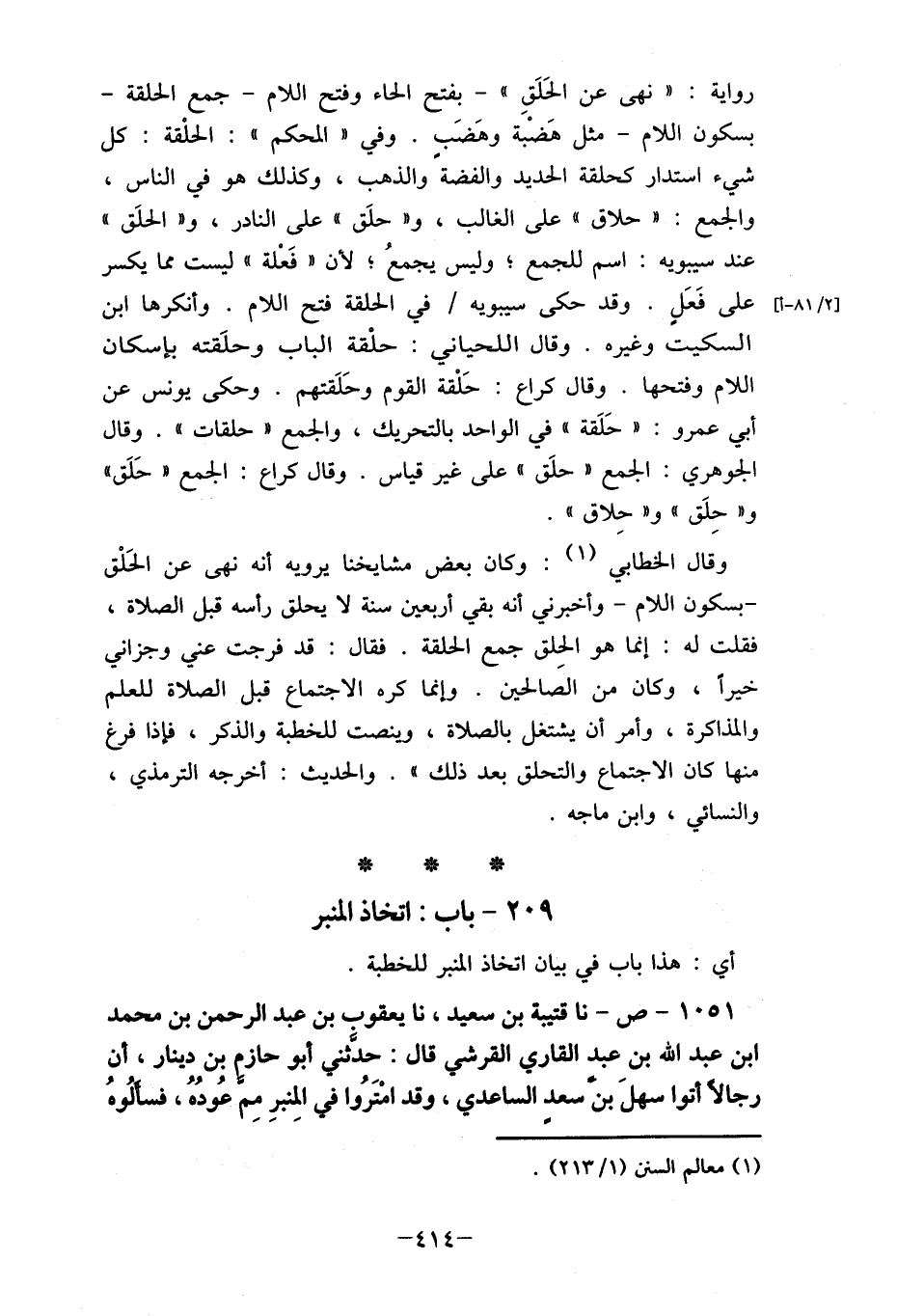- بسكون اللام- وأخبرني أنه بقي أربعين سنة لا يحلق رأسه قبل الصلاة، فقلت له: إنما هو الحِلق جمع الحلقة. فقال: قد فرجت عني وجزاني خيراَ، وكان من الصالحين. وإنما كره الاجتماع قبل الصلاة للعلم والمذاكرة، وأمر أن يشتغل بالصلاة، وينصت للخطبة والذكر، فإذا فرغ منها كان الاجتماع والتحلق بعد ذلك ". والحديث: أخرجه الترمذي، والنسائي، وابن ماجه.