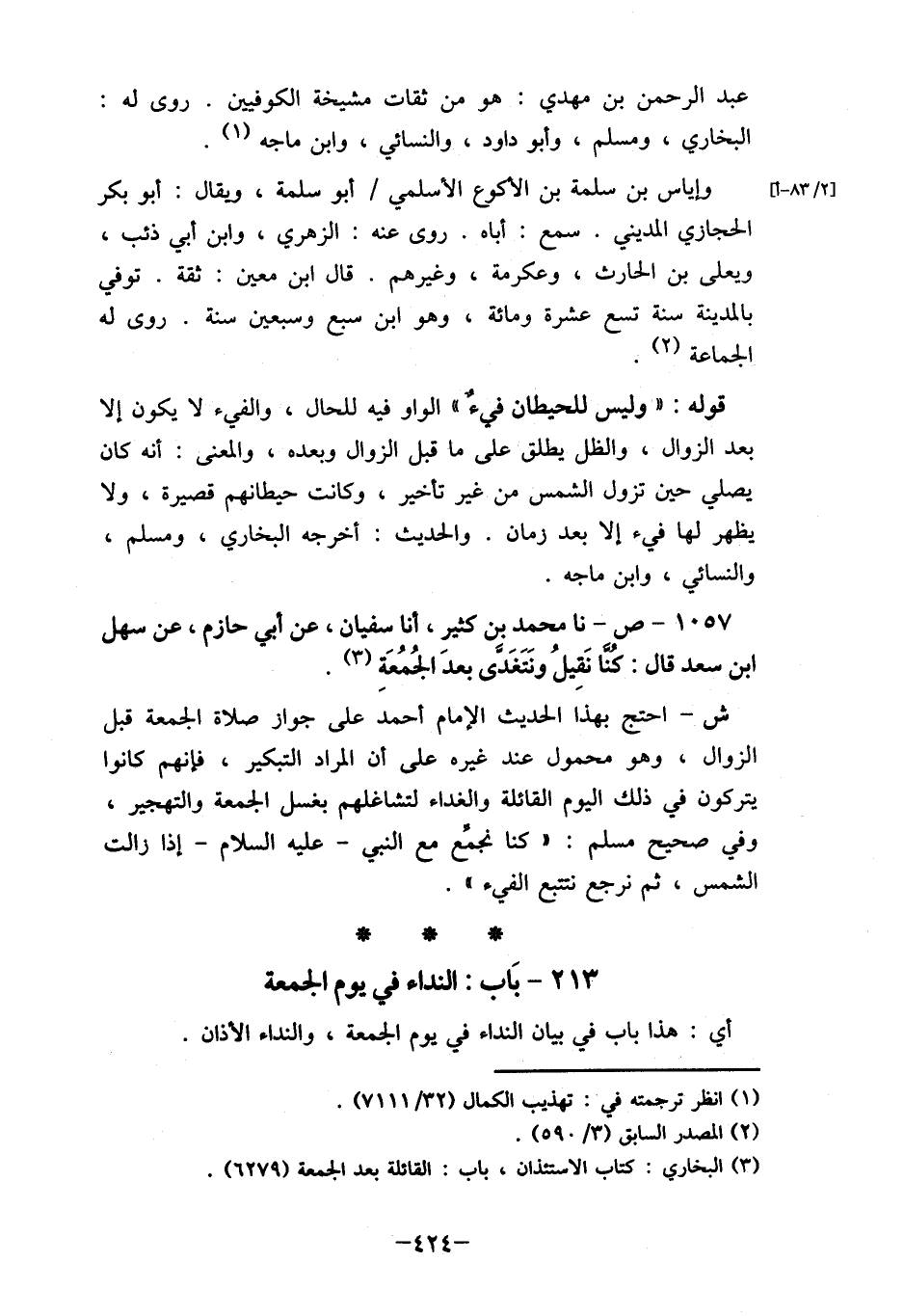 1057- ص- نا محمد بن كثير، أنا سفيان، عن أبي حازم، عن سهل ابن سعد قال: كنا نَقِيلُ ونَتَغَدى بعدَ الجُمُعَةِ (3) .