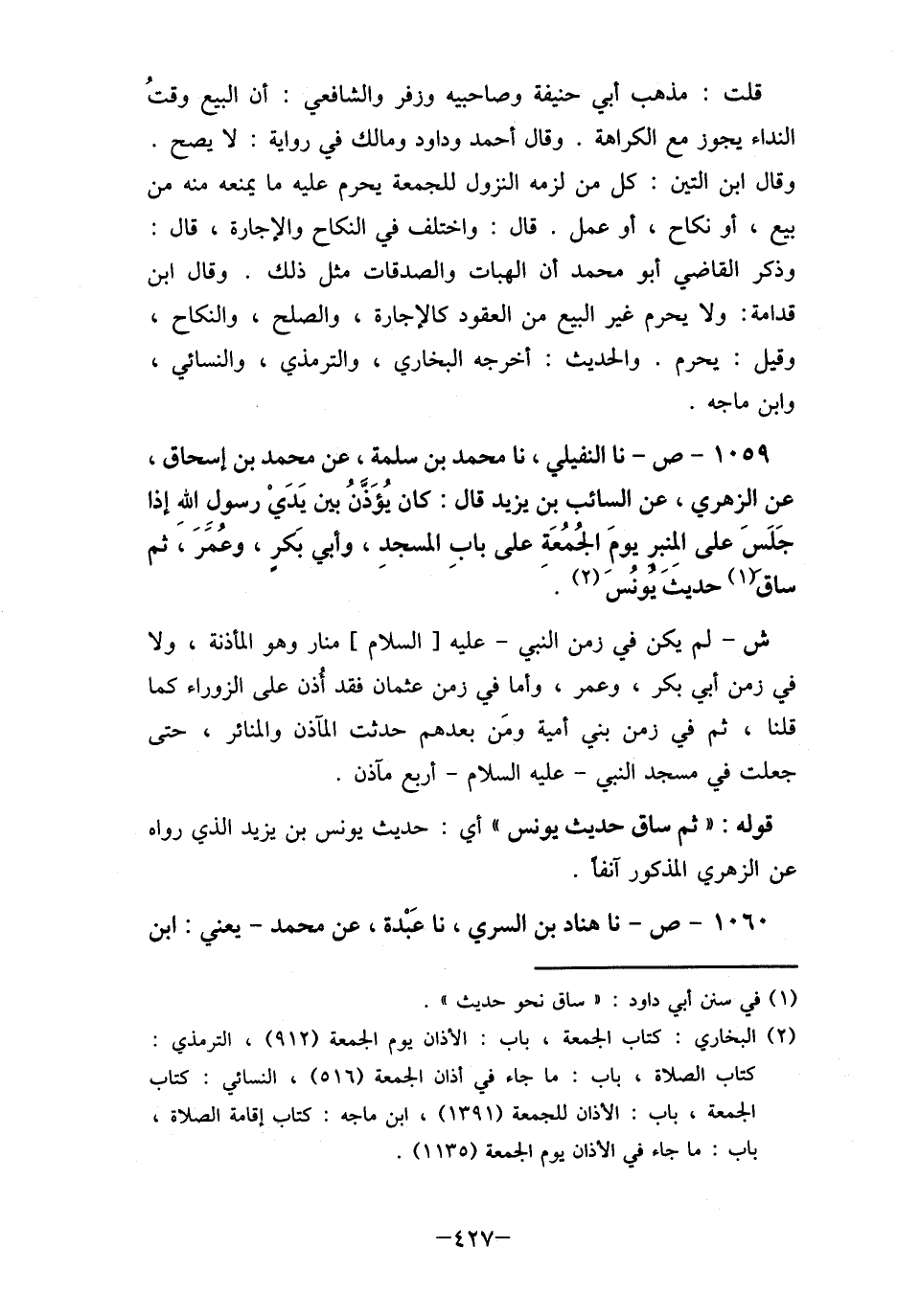 1059- ص- نا النفيلي، نا محمد بن سلمة، عن محمد بن إسحاق، عن الزهري، عن السائب بن يزيد قال: كان يُؤَذَّنُ بين يَدَيْ رسولِ اللهِ إذا جَلَسَ على المنبر يومَ الجُمُعَةِ على بابِ المسجدِ، وأبي بَكرٍ، وعُمَرَ، ثم ساق (1) حديثً يونُسَ (2) .