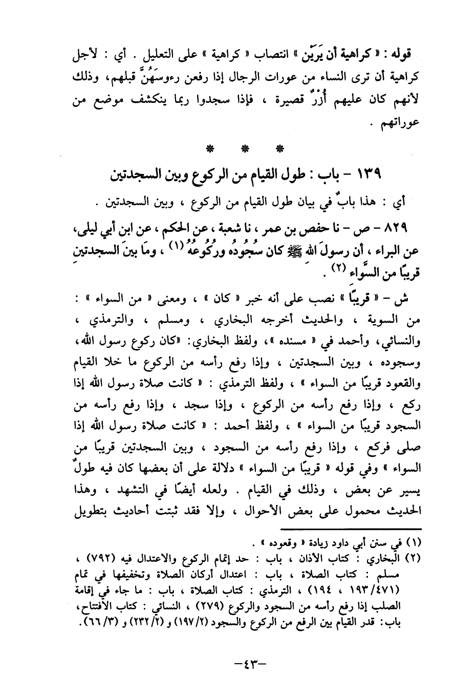 ش- "قريبا" نصب على أنه خبر "كان "، ومعنى " من السواء ": من السوية، والحديث أخرجه البخاري، ومسلم، والترمذي، والنسائي، وأحمد في " مسنده "، ولفظ البخاري: "كان ركوع رسول الله، وسجوده، وبين السجدتين، وإذا رفع رأسه من الركوع ما خلا القيام والقعود قريبَا من السواء"، ولفظ الترمذي: وكانت صلاة رسول الله إذا ركع، وإذا رفع رأسه من الركوع، وإذا سجد، وإذا رفع رأسه من السجود قريبَا من السواء"، ولفظ أحمد: " كانت صلاة رسول الله إذا صلى فركع، وإذا رفع رأسه من السجود، وبين السجدتين قريبَا من السواء" وفي قولهم قريبَا من السواء " دلالة على أن بعضها كان فيه طولٌ يسير عن بعض، وذلك في القيام. ولعله أيضا في التشهد، وهذا الحديث محمول على بعض الأحوال، وإلا فقد ثبتت أحاديث بتطويل