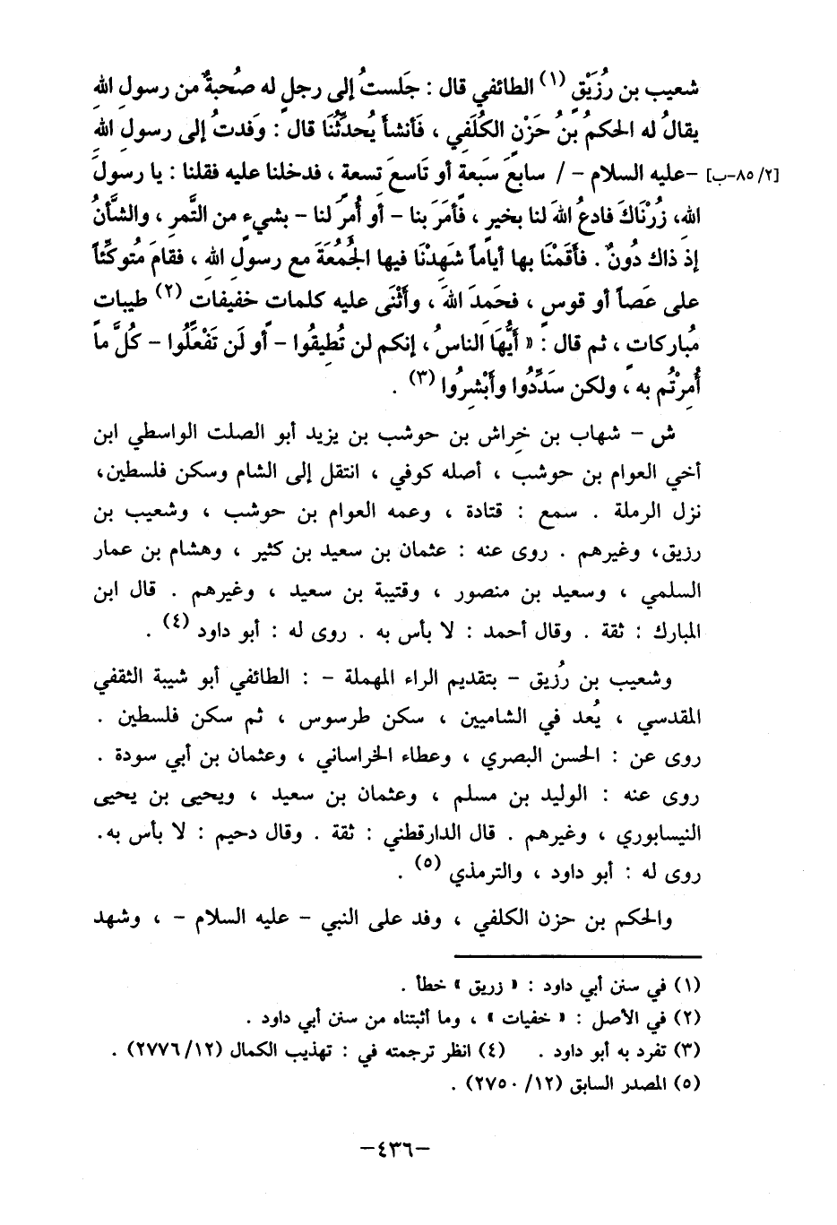شعيب بن رُزَيْقٍ (1) الطائفي قال: جَلستُ إلى رجلِ له صُحبة من رسول الله يقالُ له الحكمُ بنُ حَزْنٍ الكُلَفِي، فَأنشأ يُحدثنا قال: وَفدتُ إلى رسولَ الله - عليه السلام-/ سابعَ سَبعة أو تاسعَ تسعة، فدخلنا عليه فقلنا: يا رسولً الله، زُرْنَاكَ فادعُ اللهَ لنا بخير، فَأمَرَ بنا- أَو أمرَ لنا- بشيء من التمرِ، والشأنُ إذَ ذاك دُون. فأقَمْنَا بها أياًما شَهِدْنَا فيها الجمُعَةَ مع رسوَل اللهِ، فقامَ مُتوكِّئاً على عَصاً أو قوس، فحَمدَ الله، وأثْنَى عليه كلمات خفَيفات (2) طيبات مُباركات، ثم قال: " أيها اَلناسُ، إنكم لن تُطيقُوا- أَو لَن تَفْعًلُوا- كُل مال أمِرْتُم به، ولكن سَدِّدوا وأبْشِرُوا (3) .