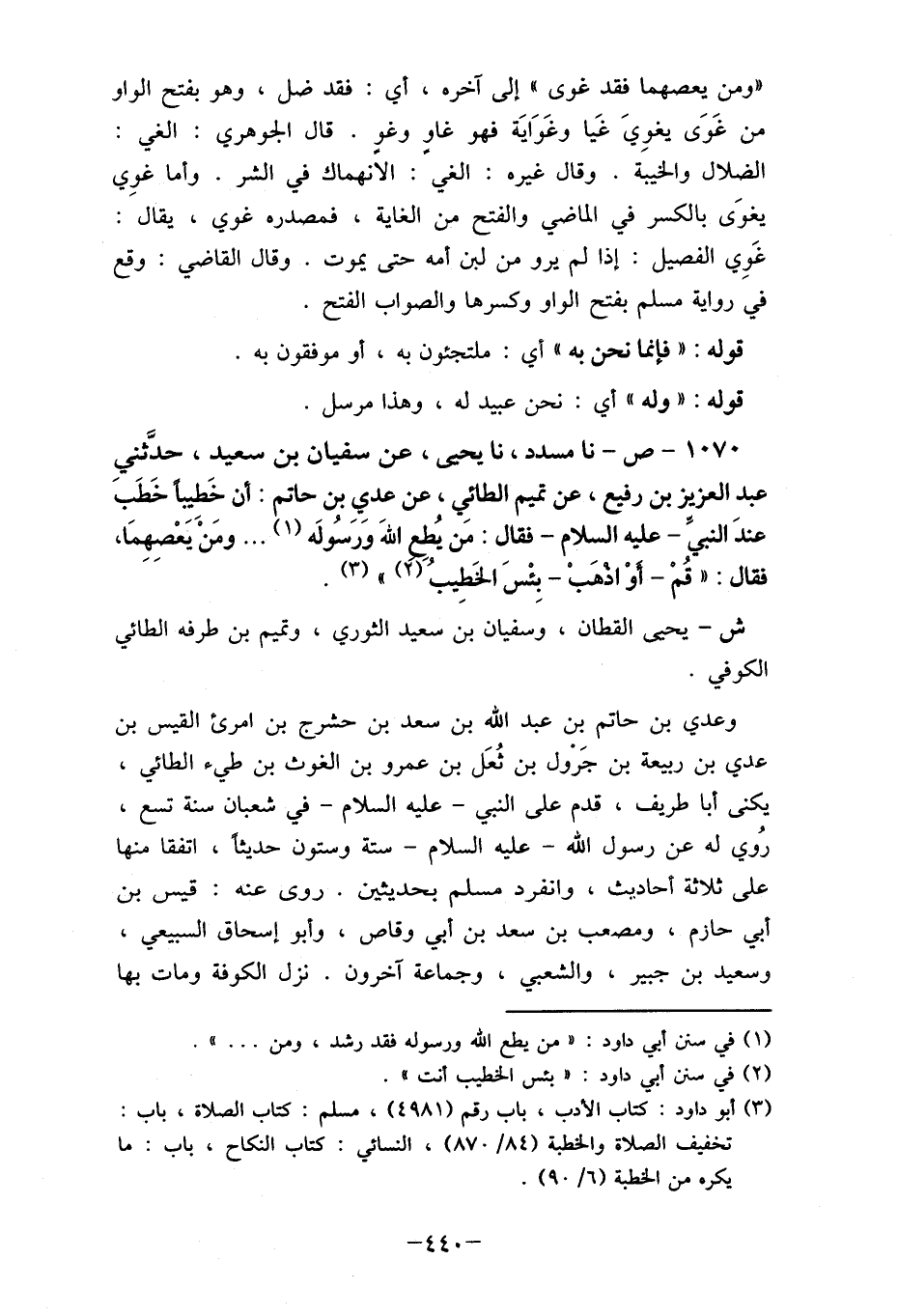 1070- ص- نا مسدد، نا يحيى، عن سفيان بن سعيد، حدَّثني عبد العزيز بن رفيع، عن تميم الطائيِ، عن عديِ بن حاتم: أن خَطِيباً خَطَبَ عندَ النبي- عليه السلام- فقال: من يُطِع اللهَ وَرسُولَه (1) ... ومَنْ يَعْصهمَا، فقال: " قُمْ- أَوْ اذهبْ- بِئْسَ الخَطِيبُ (2) " (3) .