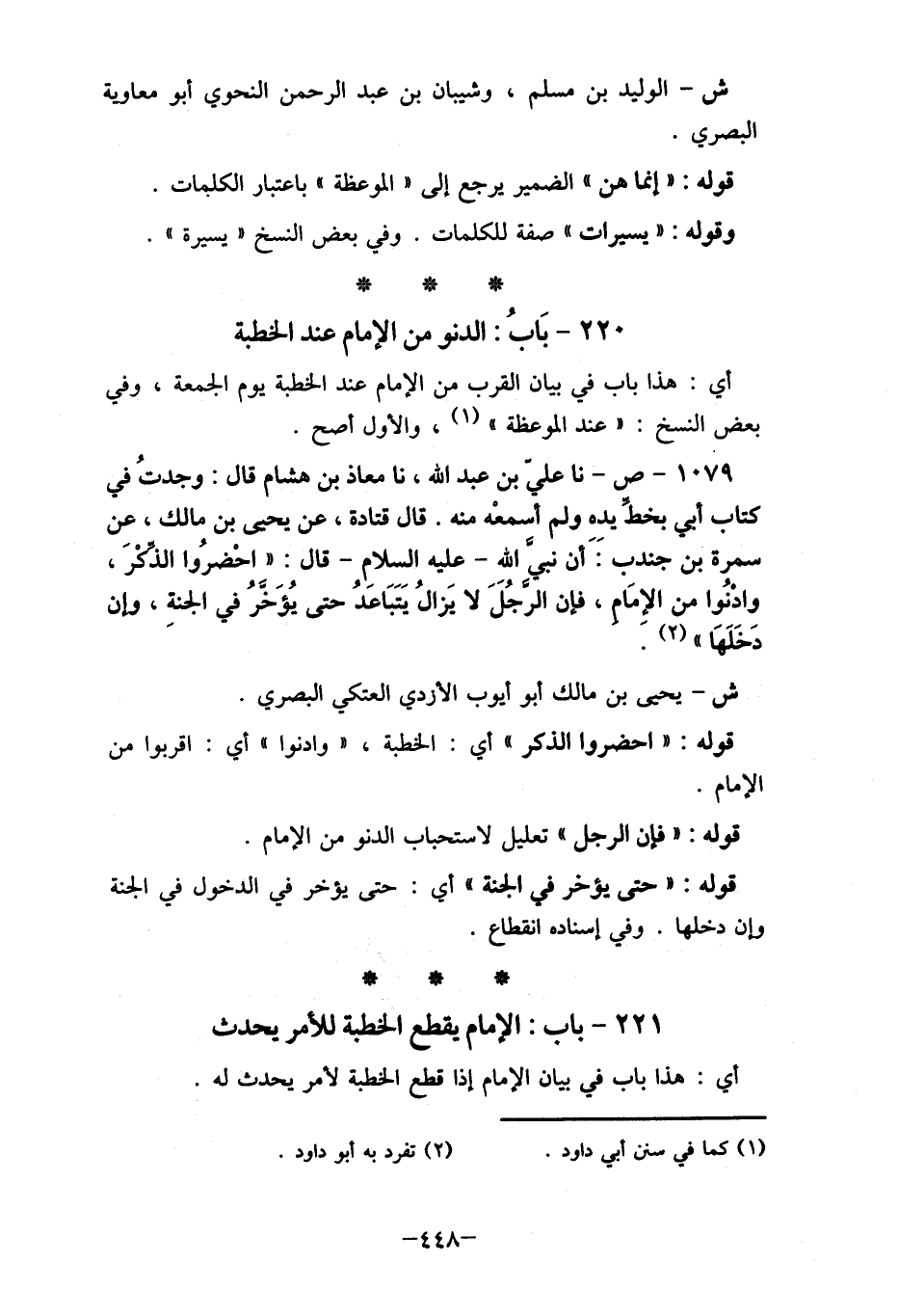 1079- ص- نا علي بن عبد الله، نا معاذ بن هشام قال: وجدتُ في كتاب أبي بخط يده ولم أسمعْه منه. قال قتادة، عن يحيي بن مالك، عن سمرة بن جندب أن نبي الله- عليه السلام- قال: "احْضرُوا الذكرَ، وادْنُوا من الإمَام، فإن الرجل لا يَزالُ يَتَبَاعَدُ حتى يُؤَخرُ في الجنة، وإن دَخَلَهَا" (2)