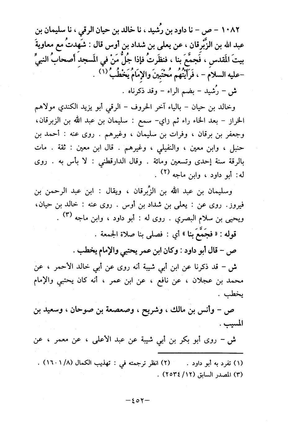 1082- ص- نا داود بن رُشيد، نا خالد بن حيان الرقي، نا سليمان بن عبد الله بن الزَّبْرِقان، عن يعلى بن شداد بن أوس قال: شَهِدتُ مع معاويةَ بيتَ المَقدسِ، فَجمَّعَ بنا، فنظَرتُ فإذا جُلُّ مَنْ في المَسجد أصحابُ النبيِّ - عليه السلام-، فَرَأيْتُهُم مُحْتَبِينَ والإِمَامُ يَخْطُبُ (1) .