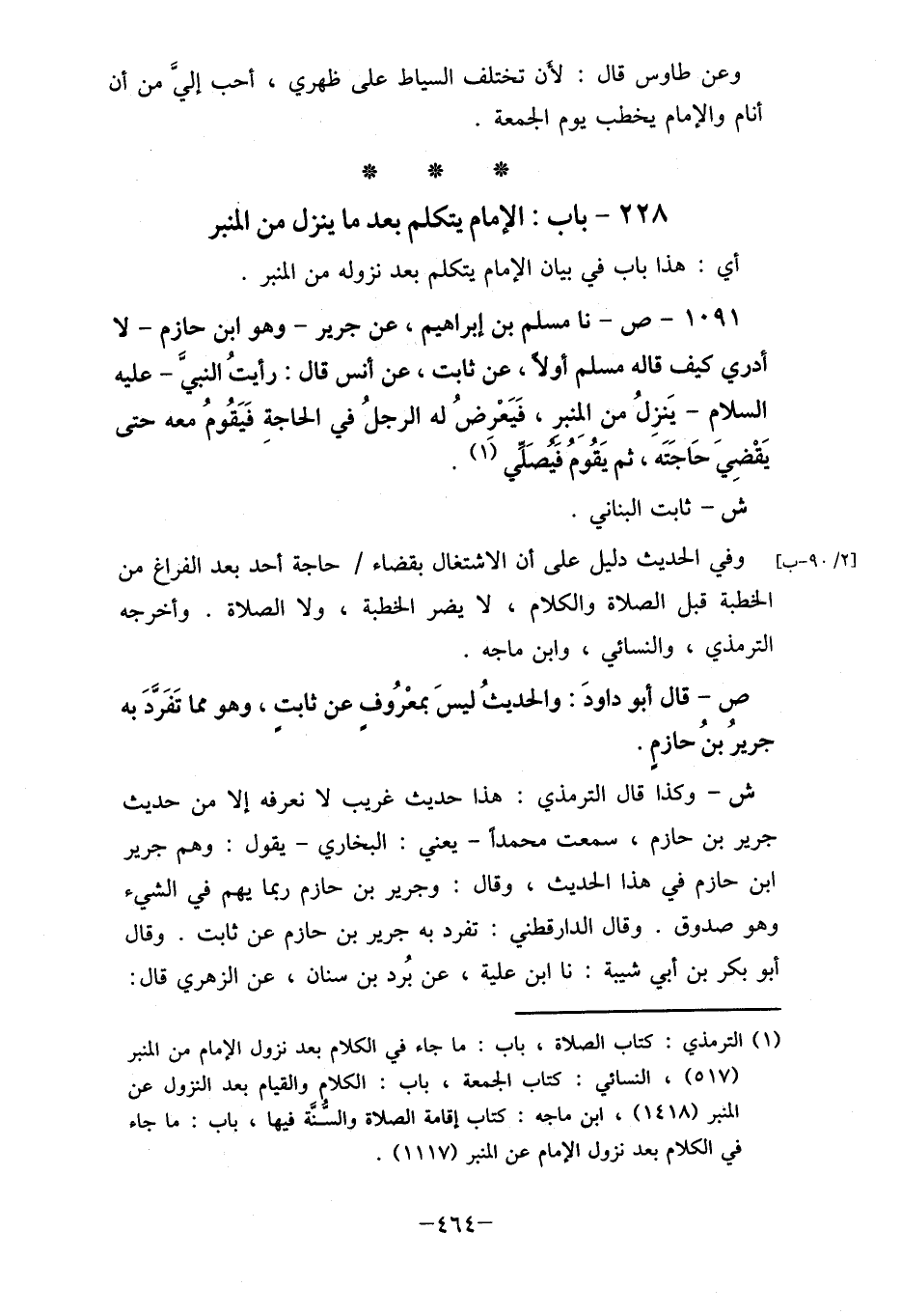 (1) الترمذي: كتاب الصلاة، باب: ما جاء في الكلام بعد نزول الإمام من المنبر (517) ، النسائي: كتاب الجمعة، باب: الكلام والقيام بعد النزول عن المنبر (1418) ، ابن ماجه: كتاب إقامة الصلاة والسُنَة فيها، باب: ما جاء في الكلام بعد نزول الإمام عن المنبر (1117) .