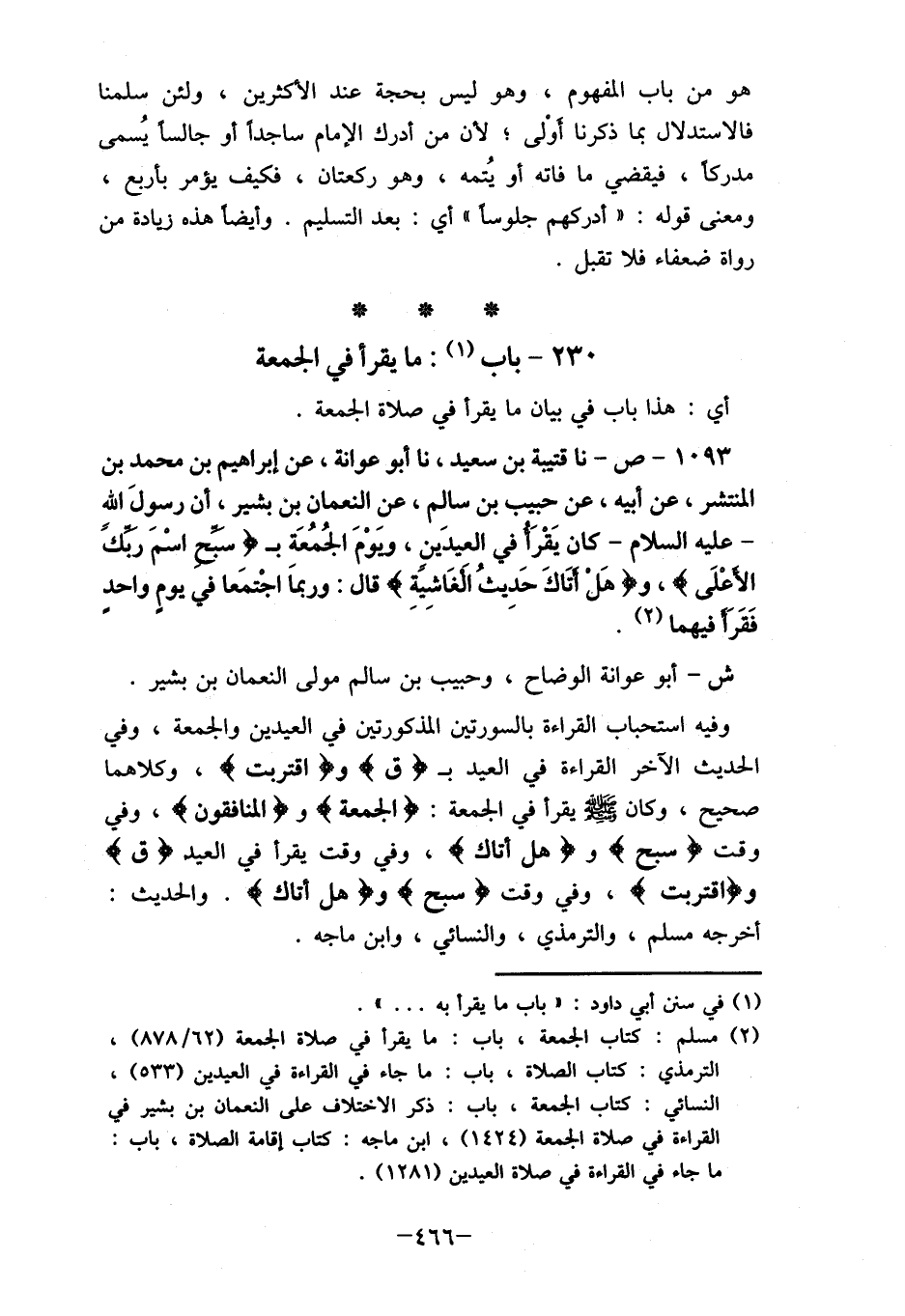 1093- ص- نا قتيبة بن سعيد، نا أبو عوانة، عن إبراهيم بن محمد بن المنتشر، عن أبيه، عن حبيب بن سالم، عن النعمان بن بشير، أن رسولَ الله - عليه السلام- كان يَقْرَأ في العيدَينٍ، ويوْمَ الجُمُعَة بـ "سبح اسْمَ ربكً الأعْلَى"، و "هَلْ أتَاكَ حَديثُ الَغَاشية" قال: "ربماَ اجْتمَعا في يوم واحد فَقَرَأ فيهما (2) .