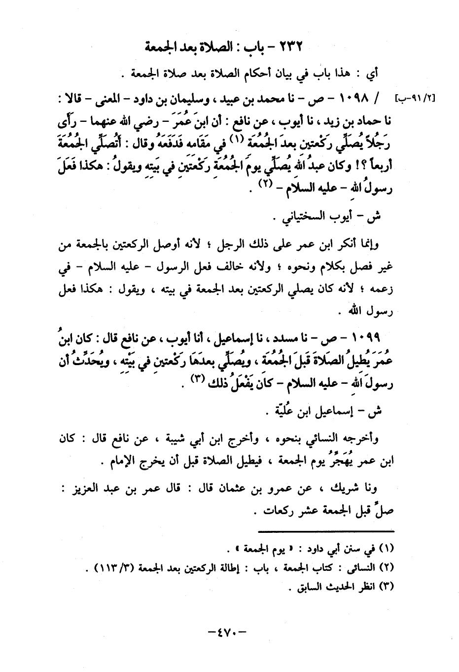 1099- ص- نا مسدد، نا إسماعيل، أنا أيوب، عن ناِفع قال: كان ابنُ عُمَرَ يُطيلُ الصَلاةَ قَبلَ الجُمُعَة، وبُصَلي بعدها ركعتين في بيْته، ويُحَدثُ أن رسولَ الله- عليه السلام- كاَن يَفعَلُ ذلك (3) .