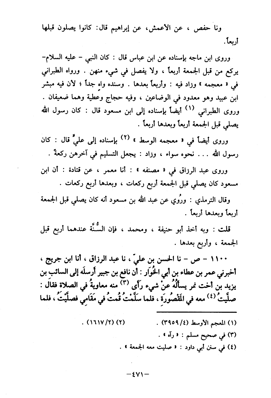 وروى ابن ماجه بإسناده عن ابن عباس قال: كان النبي- عليه السلام- يركع من قبل الجمعة أربعاً، ولا يفصل في شيء منهن. ورواه الطبراني في "معجمه" وراد فيه: وأربعاً بعدها. وسنده واهِ جداً؛ لأن فيه مبشر ابن عبيد وهو معدود في الوضاعين، وفيه حجاج وعطية وهما ضعيفان. وروى الطبراني (1) أيضا بإسناده إلى ابن مسعود قال: كان رسول الله يصلي قبل الجمعة أربعاً وبعدها أربعاً.