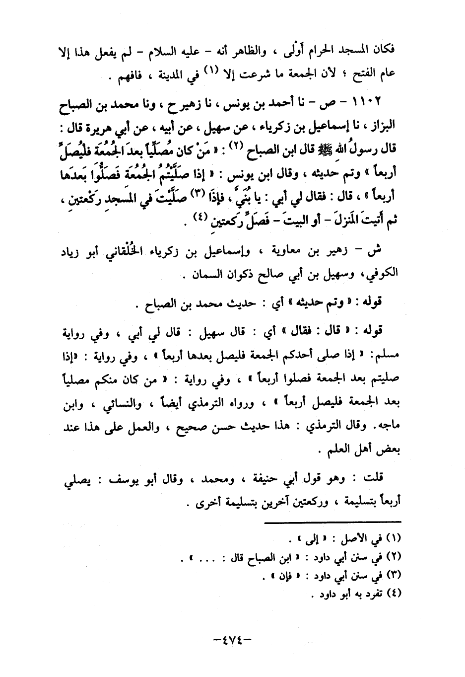 1102- ص- نا أحمد بن يونس، نا زهيرح، ونا محمد بن الصباح البزاز، نا إسماعيل بن زكرياء، عن سهيل، عن أبيه، عن أبي هريرة قال: قال رسولُ الله " قال ابن الصباح (2) : (مَن كان مُصَلياً بعدَ الجُمُعَة فليُصَل أربعاً) وتم حديثه، وقال ابن يونس: "إذا صليتُمُ الجُمُعَة فَصَلُّوَا بَعدها أربعاً"، قال: فقال لي أبي: يا بُنَي، فإذا (3) صليتَ في المسَجد رَكعتين، ثم أَتيتَ المَنزلَ- أو البيتَ- فَصَل ركعتين (4) .