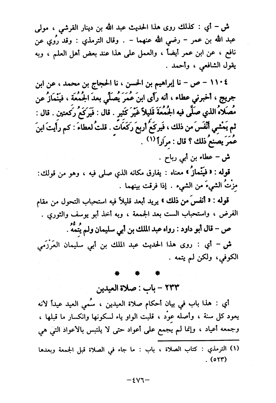 1104- ص- نا إبراهيم بن الحسن، نا الحجاج بن محمد، عن ابن جريج، أخبرني عطاء، أنه رَأى ابنَ عُمَرَ يُصَلي بعدَ الجُمُعَة، فيَنمَازُ عن مُصَلاهُ الذي صلي فيه الجُمُعَةَ قَلِيلاَ غيرَ كَثِيرِ. قال: فَيَرَكَعُ رَكَعتين. قال: ثم يَمشِي أنفَسَ من ذلك، فَيركَعُ أربعَ رَكَعَات. قلتُ لعطاءَ: كم رَأيتَ ابنَ عُمَرَ يصنعُ ذلك؟ قال: مِرَاراً (1) .
