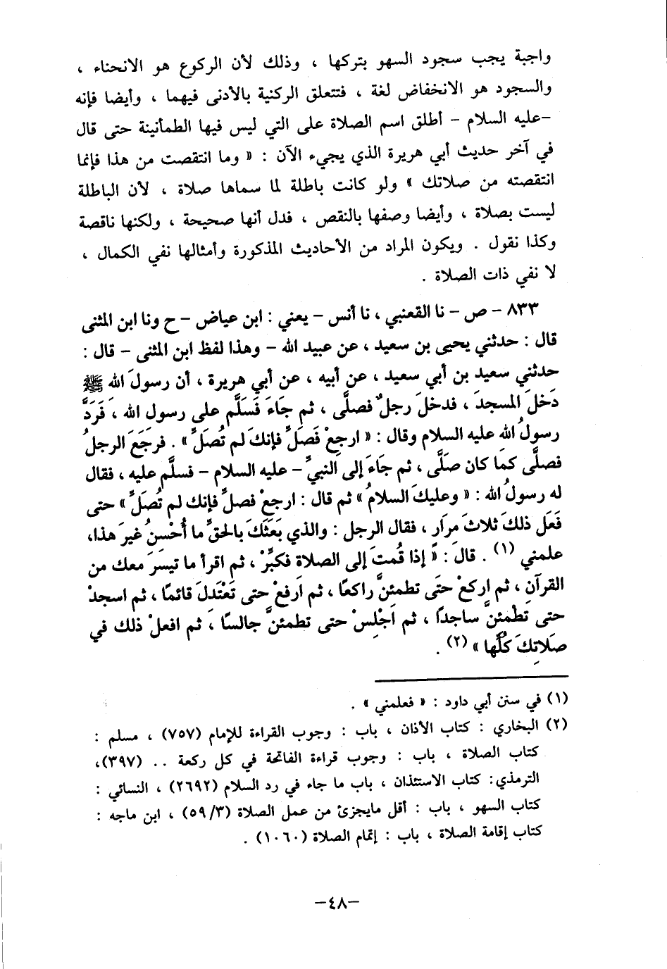 833- ص- نا القعنبي، نا أنس- يعني: ابن عياض- ح ونا ابن المثنى قال: حدثني يحيي بن سعيد، عن عبيد الله- وهذا لفظ ابن المثنى- قال: حدثنا سعيد بن أبي سعيد، عن أبيه، عن أبي هريرة، أن رسول الله - صلى الله عليه وسلم - دَخلَ المسجدَ، فدخلَ رجل فصلَّى، ثم جَاءَ فَسَلَّم على رسول الله، فَر رسولُ الله عليه السلام وقال: " ارجِعْ فَصَل فإنكَ لم تُصَل ". فرجَعً الرجلُ فصلَّى كمَا كان صلى، ثم جَاءَ إلى النبي- عليه السلام- فسلَّم عليه، فقال له رسولُ الله: " وعليكَ السلامُ " ثم قال: ارجع فصل فإنك لم تُصَل " حتى فَعَل ذلكَ ثلاثَ مرَار، فقال الرجل: والذي بَعَثَكَ بالحق ما أحْسِنُ غيرَ هذا، علمني (1) . قالَ: "إذا قُمتَ إلى الصلاة فكبر، ثم اقرأ ما تيسر معك من القرآن، ثم اركعْ حتَى تطمئنَّ راكعًا، ثم اَرفع حتى تعتَدلَ قائمًا، ثم اسجدْ حتى تَطمئن ساجدا، ثم اجلسْ حتى تطمئن جالسًا، ثم افعلْ فلك في صَلاِتكَ ككل" (2) .