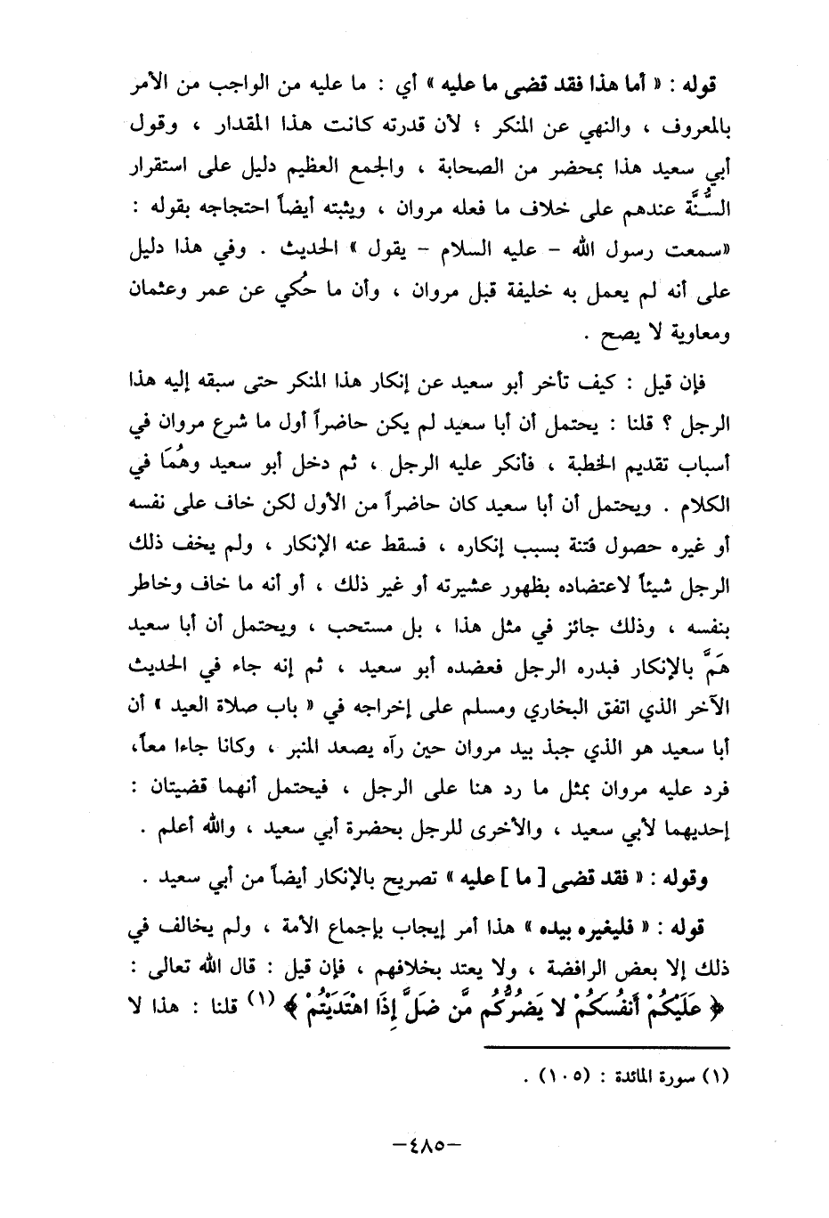 فإن قيل: كيف تأخر أبو سعيد عن إنكار هذا المنكر حتى سبقه إليه هذا الرجل؟ قلنا: يحتمل أن أبا سعيد لم يكن حاضراً أول ما شرع مروان في أسباب تقديم الخطبة، فأنكر عليه الرجل، ثم دخل أبو سعيد وهُمَا في الكلام. ويحتمل أن أبا سعيد كان حاضراً من الأول لكن خاف على نفسه أو غيره حصول فتنة بسبب إنكاره، فسقط عنه الإنكار، ولم يخف ذلك الرجل شيئاً لاعتضاده بظهور عشيرته أو غير ذلك، أو أنه ما خاف وخاطر بنفسه، وذلك جائز في مثل هذا، بل مستحب، ويحتمل أن أبا سعيد هَم بالإنكار فبدره الرجل فعضده أبو سعيد، ثم إنه جاء في الحديث الآخر الذي اتفق البخاري ومسلم على إخراجه في "باب صلاة العيد " أن أبا سعيد هو الذي جبذ بيد مروان حين راَه يصعد المنبر، وكانا جاءا معاً، فرد عليه مروان بمثل ما رد هنا على الرجل، فيحتمل أنهما قضيتان: إحديهما لأبي سعيد، والأخرى للرجل بحضرة أبي سعيد، والله أعلم. وقوله: "فقد قضى [ما] ، عليه" تصريح بالإنكار أيضا من أبي سعيد. قوله: " فليغيره بيده " هذا أمر إيجاب بإجماع الأمة، ولم يخالف في ذلك إلا بعض الرافضة، ولا يعتد بخلافهم، فإن قيل: قال الله تعالى: "عَلَيكُمْ أنفُسكُمْ لا يَضُركم مَّا ضَلَّ إِذَا اهْتَدَيْتُمْ " (1) قلنا: هذا لا