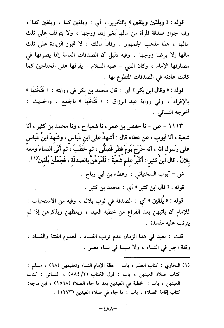 1113- ص- نا حفص بن عمر، نا شعبة ح، ولا محمد بن كثير، أنا شعبة، أنا أيوب، عن عطاء قال: أشهدُ على ابنِ عَباس، وشَهِدَ ابنُ عَباس على رَسول الله، أنه خَرَجَ يَومَ فطر فَصَلَّى، ثم خَطَبَ، ثم أتَى النساءَ ومعه بلال. قال اَبنُ كثير: أكْبَرُ عِلم شُعبةَ: فَأمَرَهُنَّ بالصدقَةِ، فَجَعَلنَ يُلقِين" (1) . ش- أيوب السختياني، وعطاء بن أبي رباح.