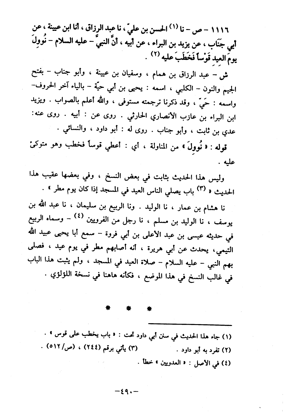 1116- ص- نا (1) الحسن بن علي، نا عبد الرزاق، أنا ابن عيينة، عن أي جَنَاب، عن يزيد بن البراء، عن أبيه، أنً النبي- عليه السلام- نُووِلَ يومَ العِيدِ قَوْساً فَخَطَبَ عليه (2) .