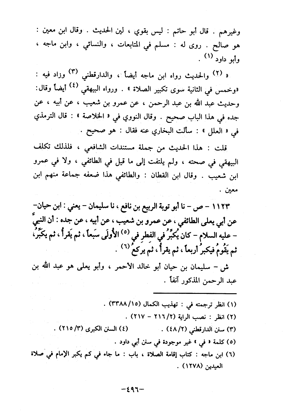 1123- ص- نا أبو توبة الربيع بن نافع، نا سليمان- يعني: ابن حيان- عن أبي يعلى الطائفي، عن عمرو بن شعيب، عن أبيه، عن جده: أن النبي - عليه السلام- كان يُكبر في الفِطرِ في (5) الأولَى سَبعاً، ثم يَقرأ، ثم يكبرُ، ثم يَقُومُ فيكبرُ أربعاً، ثم يقرأ، ثم يركعُ (6) .