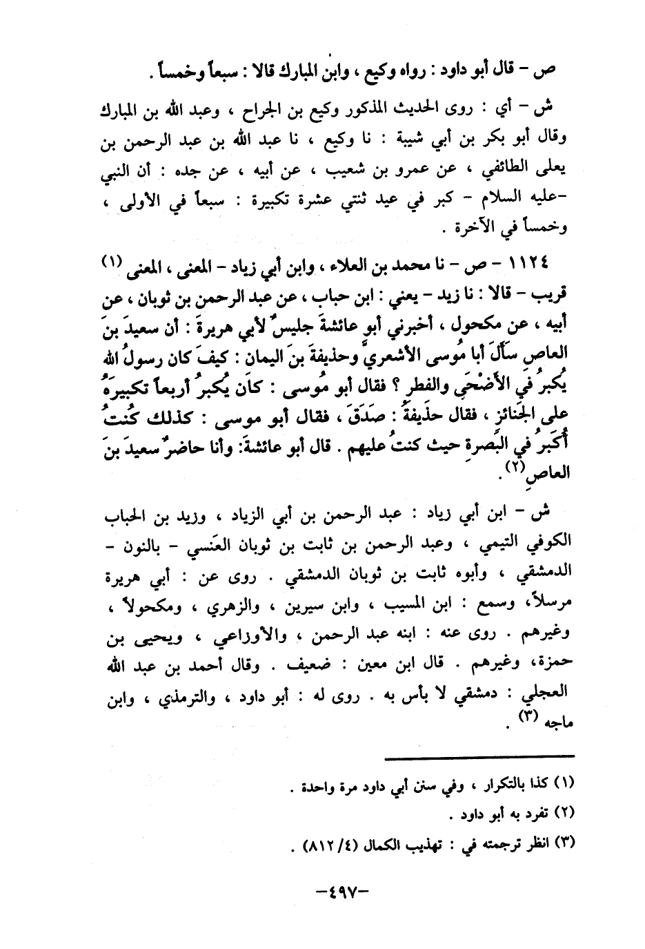 1124- ص- نا محمد بن العلاء، وابن أبي زياد- المعنى، المعنى (1) قريب- قالا: نا زيد- يعني: ابن حباب، عن عبد الرحمن بن ثوبان، عنه أبيه، عن مكحول، أخبرني أبو عائشةَ جليسٌ لأبى هريرةَ: أن سعيدَ بن العاصِ سَألَ أبا مُوسى الأشعري وحذيفةَ بنَ اليمان: كيفَ كان رسولُ الله يُكبرُ في الأضْحَى والفطر؟ فقال أبو مُوسى: كاَنْ يكبرُ أربعاً تكبيرَهُ على الجَنائز، فقال حذيفة: صدَقَ، فقال أبو موسى: كذلك كُنتُ أكبرُ في البصرة حيث كنتُ عليهم. قال أبو عائشةَ: وأنا حاضر سعيدَ بنَ العاصِ (2) .