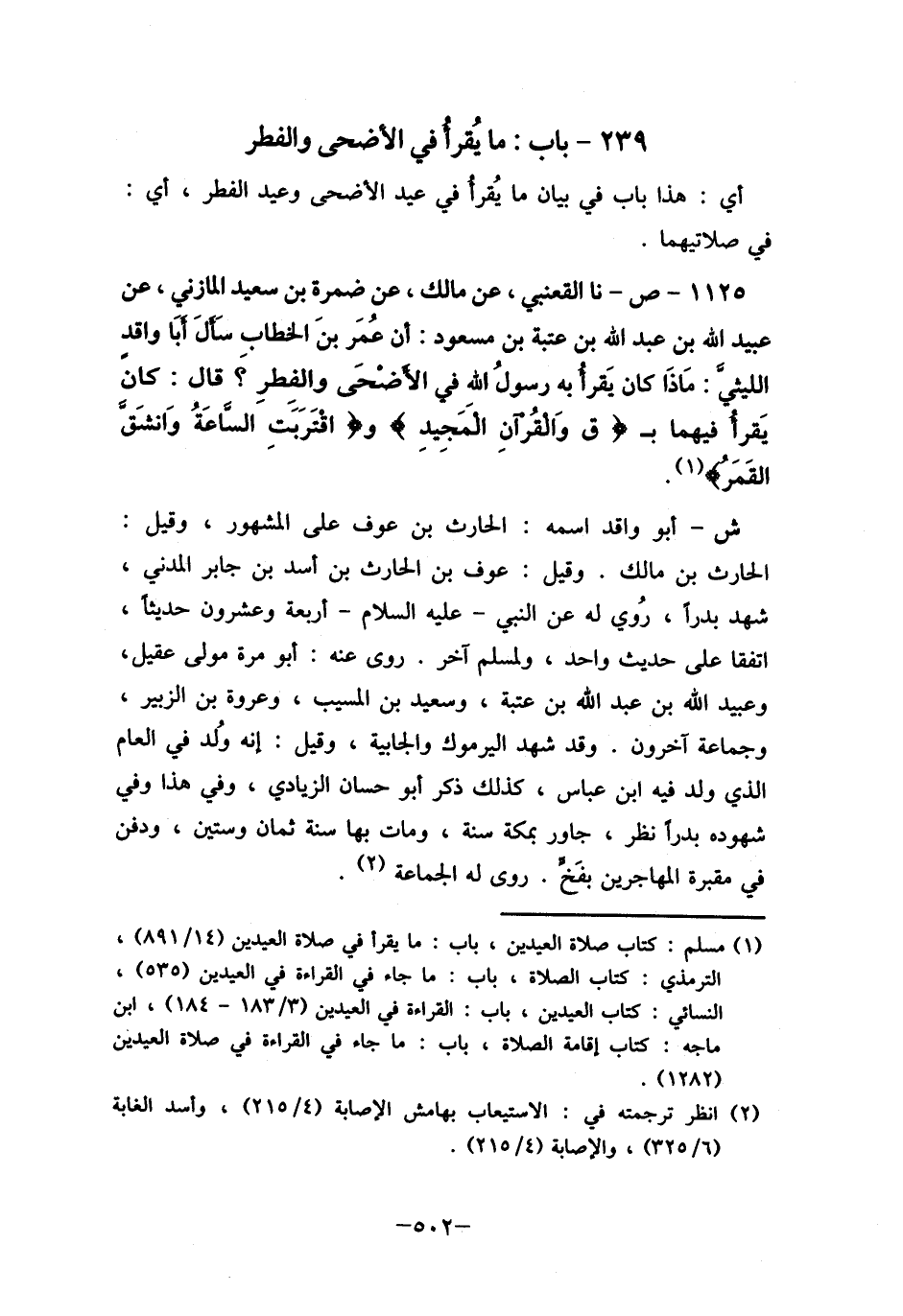 1125- ص- نا القعنبي، عن مالك، عن ضمرة بن سعيد المازني، عن عبيد الله بن عبد الله بن عتبة بن مسعود: أن عُمَر بنَ الخطاب سَألَ أبَا واقدٍ الليثي: مَاذَا كان يَقرأ به رسولُ الله في الأضْحَى والفطرِ؟ قال: كان يَقرأ فيهما بـ {ق وَالقُرآن المًجيد} و {اقْتَرَبًت الساعَةُ وَانشَق القَمَر} (1) .ًَ