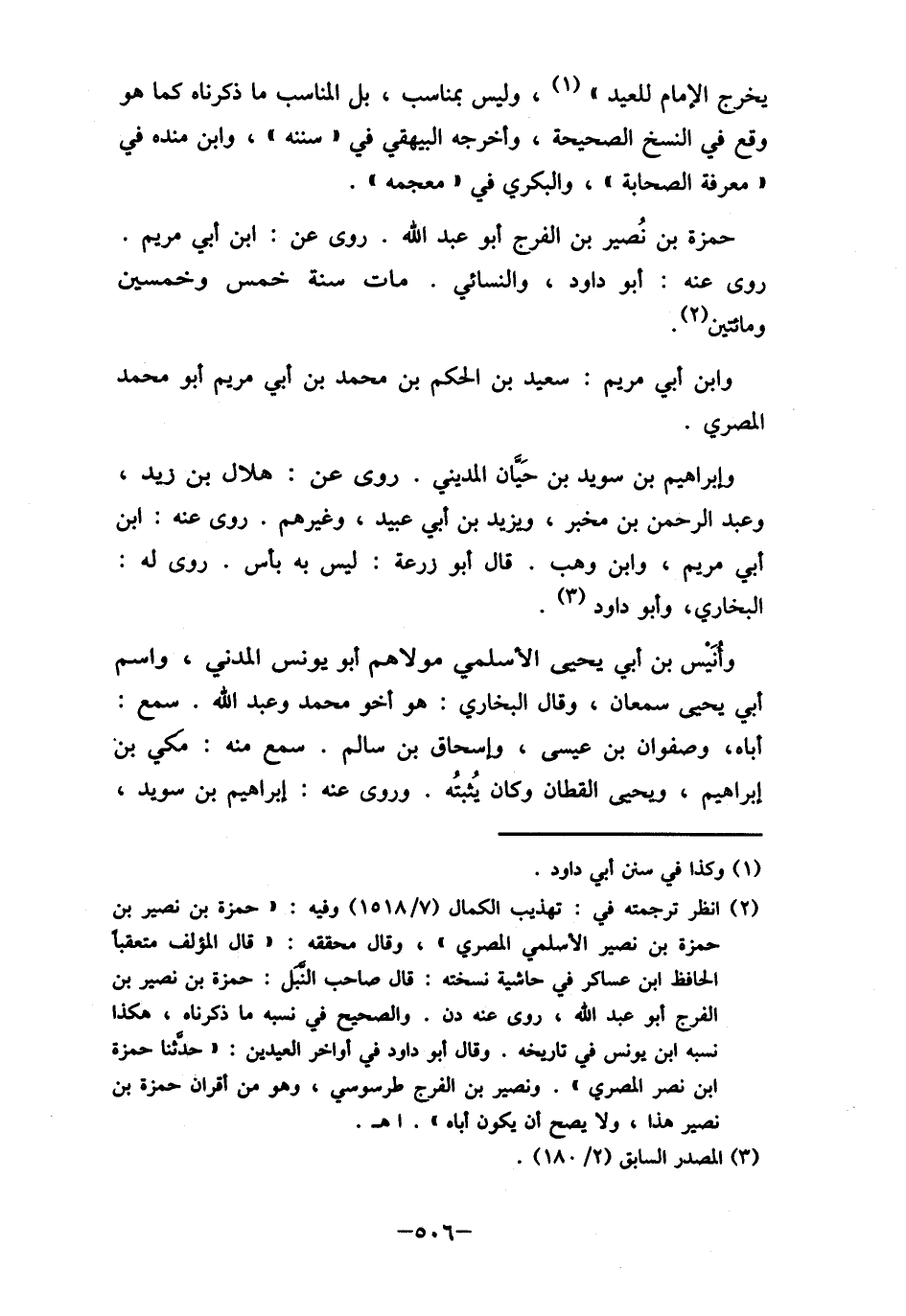 (2) انظر ترجمته في: تهذيب الكمال (1518/7) وفيه: "حمزة بن نصير بن حمزة بن نصير الأسلمي المصري" وقال محققه: وقال المؤلف متعقبا الحافظ ابن عساكر في حاشية نسخته: قال صاحب النبل: حمزة بن نصير بن الفرج أبو عبد الله، روى عنه دن. والصحيح في نسبه ما ذكرناه، هكذا نسبه ابن يونس في تاريخه. وقال أبو داود في أواخر العيدين: "حدثنا حمزة ابن نصر المصري". ونصير بن الفرج طرسوسي، وهو من أقران حمزة بن نصير هذا، ولا يصح أن يكون أباه" ا. هـ.