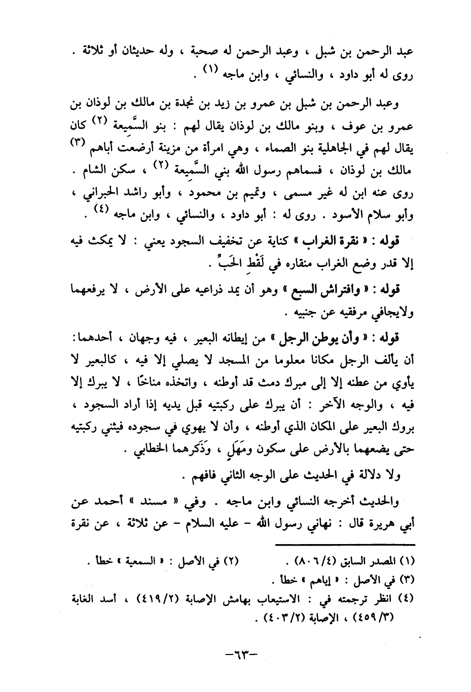 وعبد الرحمن بن شبل بن عمرو بن زيد بن نجدة بن مالك بن لوذان بن عمرو بن عوف، وبنو مالك بن لوذان يقال لهم: بنو السَمِيعة (2) كان يقال لهم في الجاهلية بنو الصماء، وهي امرأة من مزينة أرضعت أباهم (3) مالك بن لوذان، فسماهم رسول الله بني السميعة (2) ، سكن الشام. روى عنه ابن له غير مسمى، وتميم بن محمودَ، وأبو راشد الحبراني، وأبو سلام الأسود. روى له: أبو داود، والنسائي، وابن ماجه (4) . قوله: "نقرة الغراب " كناية عن تخفيف السجود يعني: لا يمكث فيه إلا قدر وضع الغراب منقاره في لَقْطِ الحَب.