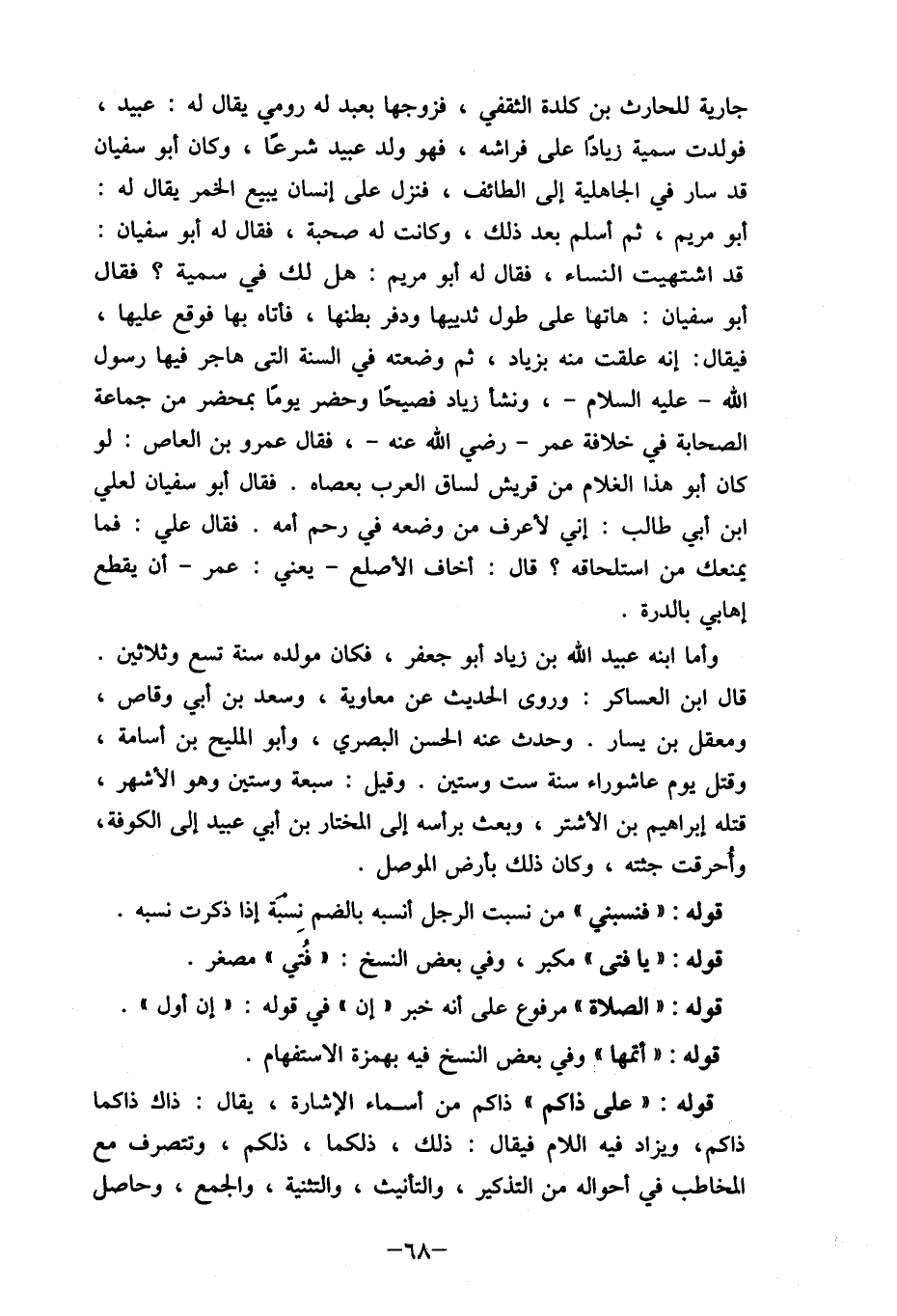 جارية للحارث بن كلدة الثقفي، فزوجها بعبد له رومي يقال له: عبيد، فولدت سمية زيادا على فراشه، فهو ولد عبيد شرعًا، وكان أبو سفيان قد سار في الجاهلية إلى الطائف، فنزل على إنسان يبيع الخمر يقال له: أبو مريم، ثم أسلم بعد ذلك، وكانت له صحبة، فقال له أبو سفيان: قد اشتهيت النساء، فقال له أبو مريم: هل لك في سمية؟ فقال أبو سفيان: هاتها على طول ثدييها ودفر بطنها، فأتاه بها فوقع عليها، فيقال: إنه علقت منه بزياد، ثم وضعته في السنة التي هاجر فيها رسول الله- عليه السلام-، ونشأ زياد فصيحَا وحضر يومَا بمحضر من جماعة الصحابة في خلافة عمر- رضي الله عنه-، فقال عمرو بن العاص: لو كان أبو هذا الغلام من قريش لساق العرب بعصاه. فقال أبو سفيان لعلي ابن أبي طالب: إني لأعرف من وضعه في رحم أمه. فقال علي: فما يمنعك من استلحاقه؟ قال: أخاف الأصلع- يعني: عمر- أن يقطع إهابي بالدرة.