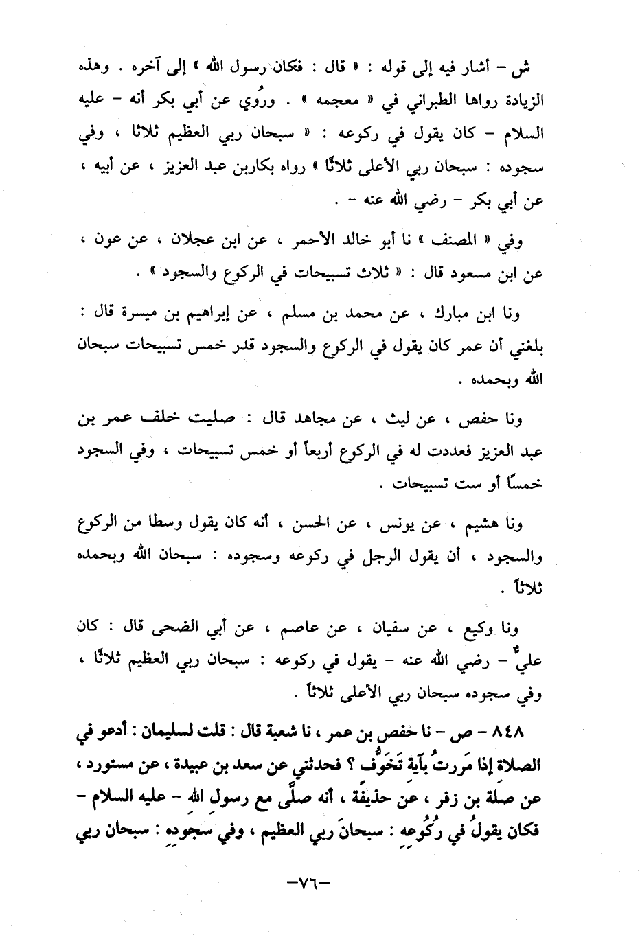 848- ص- نا حفص بن عمر، نا شعبة قال: قلت لسليمان: أدعو في الصلاة إذا مَررتُ بآيةِ تَخَوف؟ فحدثني عن سعد بن عبيدة، عن مستورد، عن صلة بن زفر، عن حذيفًة، أنه صلَّى مع رسولِ اللهِ- عليه السلام- فكان يقولُ في رُكُوعِهِ: سبحانَ ربي العظيم، وفي سجوده: سبحان ربى