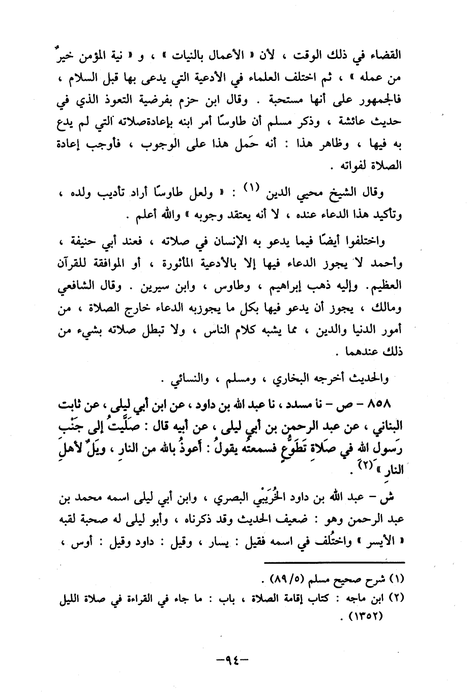 القضاء في ذلك الوقت، لأن "الأعمال بالنيات "، و" نية المؤمن خير من عمله "، ثم اختلف العلماء في الأدعية التي يدعى بها قبل السلام، فالجمهور على أنها مستحبة. وقال ابن حزم بفرضية التعوذ الذي في حديث عائشة، وذكر مسلم أن طاوسَا أمر ابنه بإعادة صلاته التي لم يدع به فيها، وظاهر هذا: أنه حَمل هذا على الوجوب، فأوجب إعادة الصلاة لفواته.