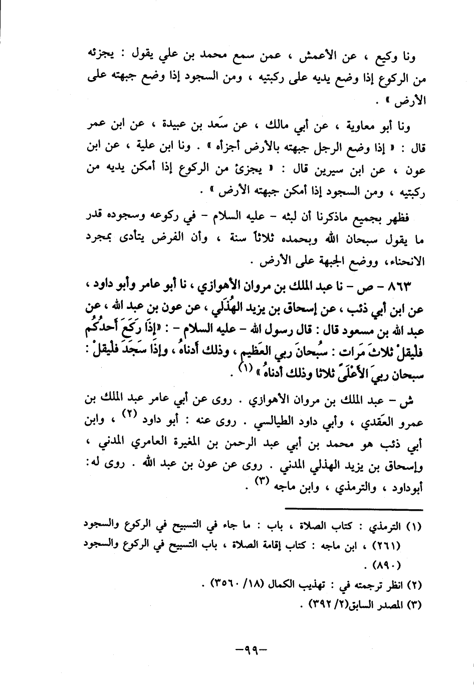 863- ص- نا عبد الملك بن مروان الأهوازي، نا أبو عامر وأبو داود، عن ابن ذئب، عن إسحاق بن يزيد الهذلي، عن عون بن عبد الله، عن عبد الله بن مسعود قال: قال رسول الله - صلى الله عليه وسلم -: "إذا رَكَعَ أحدُكُم فليقلْ ثلاثَ مَرات: سُبحانَ ربي العَظيم، وذلك أدناهُ، وإذا سَجَدَ فليقلْ: سبحان ربي الأعْلَىً ثلاثا وذلك أدناهُ " (1) .