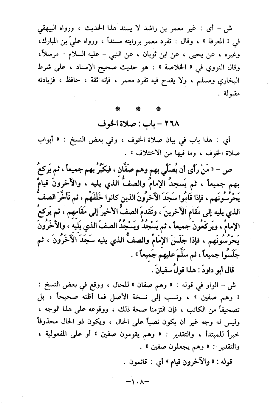 ص- " مَنْ رَأى أن يُصَلي بهم وهم صَفَّانِ، فيكبِّرُ بهم جميعاً ثم يَركعُ بهم جميعا، ثم يَسجدُ الإمامُ والصفُّ الذي يليه، والآخرون قيام يَحْرُسُونَهم، فإذا قَامُوا سَجَدَ الآخرون الذين كانوا خَلفَهُم، ثم تَأخَّرَ الصفّ الذي يليه إلى مَقام الآخرينَ، وتَقدمَ الصف الأخيرُ إلى مَقَامِهِم، ثم يَركعُ الإمامُ، ويركعون جميعا، ثم يَسْجُدُ ويَسْجُدُ الصفّ الذي يَليه، والآخرون يَحْرُسُونَهم، فإذا جَلَسَ الإمَامُ والصف الذي يليه سَجًَد الَآخَرُونَ، ثم جَلَسُوا جميعا، ثم سَلَّمَ عليهَم جَمِيعاً ".
