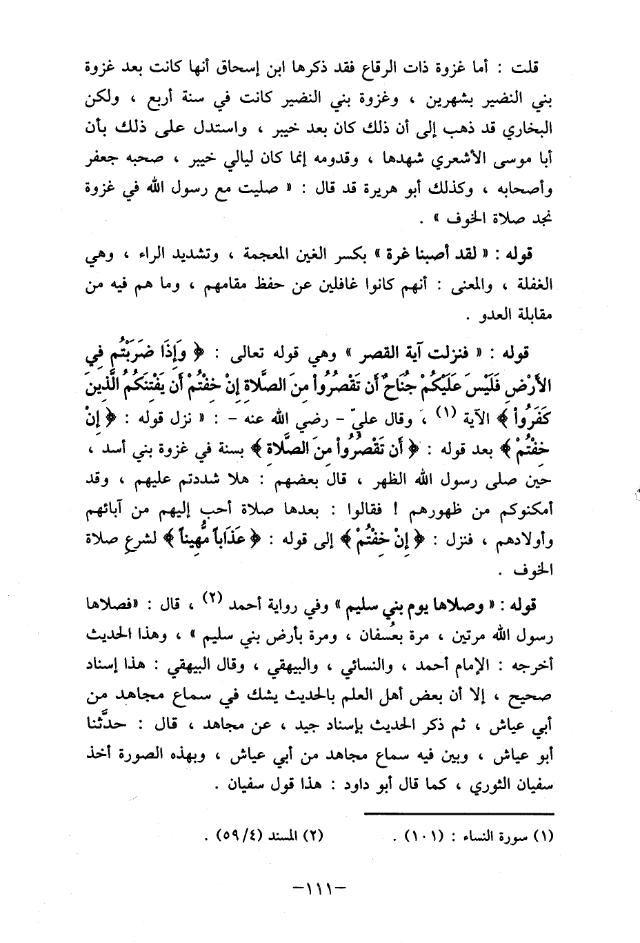 قوله: " فنزلت آية القصر " وهي قوله تعالى: {وإِذَا ضَرَبْتُم فِيِ الأرْضِ فَلَيْسَ عَليكُمْ جُنَاح أن تَقْصُرُوا مِنَ الصلاة إِنْ خِفْتُمْ أن يَفْتِنَكُمُ الذين كَفَرُوا} الآية (1) ، " وقال على- رضي الله عنه-: " نزل قوله: {أنْ خِفْتُم} بعد قوله:- {أن تَقْصرُوا منَ الصلاة} بسنة في غزوة بني أسد، حين صلى رسول الله الظهر، قالَ بعضهمَ: هلا شددتم عليهم، وقد أمكنوكم من ظهورهم! فقالوا: بعدها صلاة أحب إليهم من آبائهم وأولادهم، فنزل: {أنْ خِفْتُم} إلى قوله: {عَنَابا مهِينا} لشرع صلاة الخوف.
