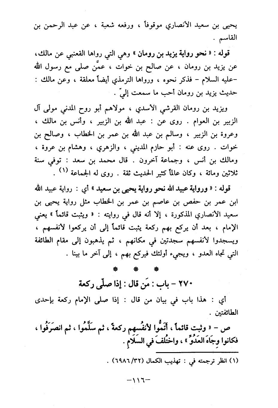قوله: " نحو رواية يزيد بن رومان " وهي التي رواها القعنبي عن مالك، عن يزيد بن رومان، عن صالح بن خوات، عمَّن صلى مع رسول الله - عليه السلام- فذكر نحوه، ورواها الترمذي أيضاً معلقة، وعن مالك: حديث يزيد بن رومان أحب ما سمعت إليّ.