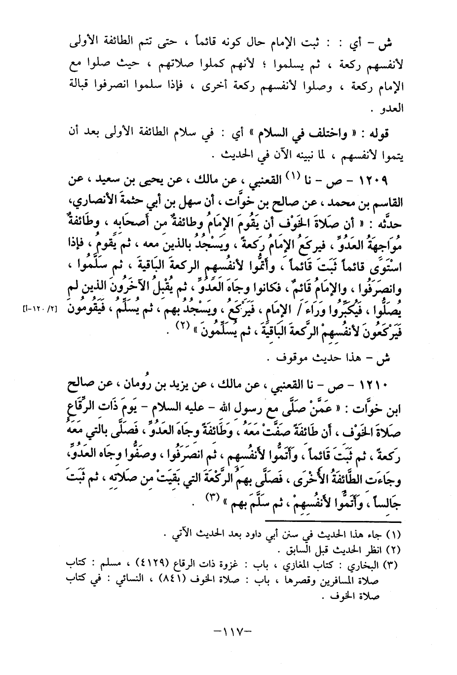 1210- ص- نا القعنبي، عن مالك، دن يزيد بن رُومان، عن صالح ابن خوَّات: " عَمنْ صَلَّى مِع رسولِ الله- عليه السلام- يَومَ ذَات الرقاع صَلاةَ الخَوْفِ، أن طَائفَة صَفتْ مَعَهُ، وَطائفَة وِجَاهَ العَدُو، فَصَلَّى بالَتي مَعه رَكعة، ثم ثبَتَ قائماً، وَأتَمُوا لأنفُسِهِم، ثم انصَرَفُوا، وصَفوا وِجَاه العَدُوَ، وجَاءَت الطَائفَةُ الأخْرَى، فَصلى بهمُ الركعَةَ التي بَقيَتْ من صَلاِتهِ، ثم ثَبَتَ جَالِسا، وَأتَموا لأنفُسِهِمْ، ثم سلم بهم " (3) .