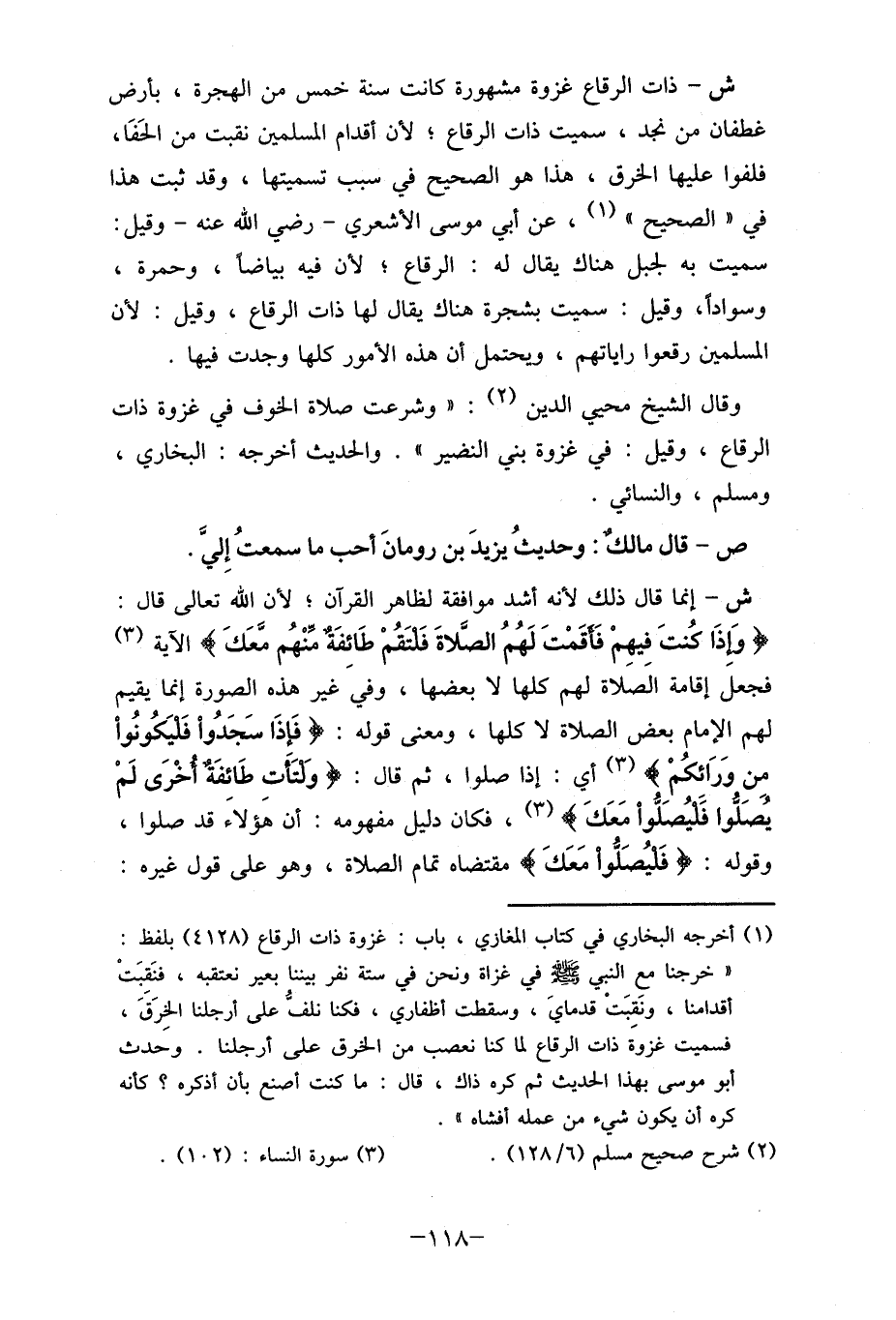 وقال الشيخ محيي الدين (2) : " وشرعت صلاة الخوف في غزوة ذات الرقاع، وقيل: في غزوة بني النضير". والحديث أخرجه: البخاري، ومسلم، والنسائي.