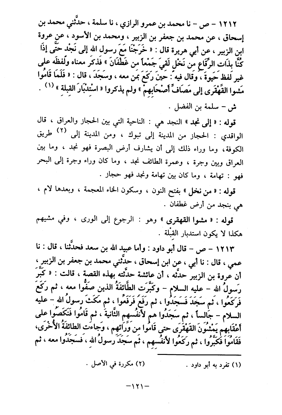1213- ص- قال أبو داود: وأما عبيد الله بن سعد فحدثنا، قال: نا عمي، قال: نا أبي، عن ابن إسحاق، حدثني محمد بن جعفر بن الزبير، أن عروة بن الزبير حدثه، أن عائشة حدثته بهذه القصة، قالت: " كَبرَ رَسولُ الله- عليه السلام- وكَبَّرَت الطَائفَةُ الذين صَفُّوا معه، ثم رَكَعَ فَرَكَعُوا، ثَم سَجَدَ فَسَجَدوا، ثم رَفَع فَرَفَعوا، ثم مَكَثَ رسولُ الله- عليه السلام- جَالِسا، ثم سَجَدُوا هم لأنفُسهِم الثانيةَ، ثم قَامُوا فَنَكَصوا على أعْقَابهِم يَمْشُونَ القَهْقَرَى حتى قَاموا مِن ود رَاِئِهِم، ونجا صك الطائفَةُ الأخْرَى، فَقَامُوَا فَكَبرُوا، ثم رَكَعُوا لأنفُسِهِم، ثم سَجدَ رسولُ اللهِ، َ فسَجًدُوا معه، ثم