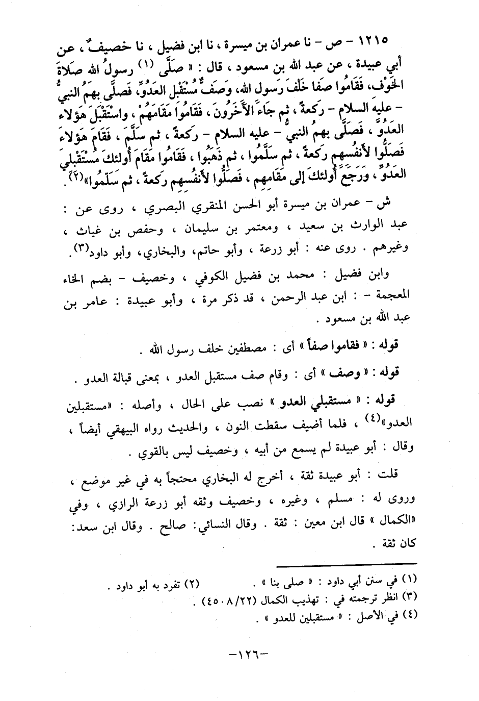 أبي عبيدة، عن عبد الله بن مسعود، قال: " صَلَّى (1) رسولُ الله صَلاةَ الخَوْف فَقَامُوا صَفا خَلفَ رَسول الله، وَصَفٌّ مُسْتَقْبل العَدُوّ، فَصلَّى بهَمُ النبيُّ - عليهَ السلام- رَكعةً، ثم جَاءً الآَخَرُونَ، فَقَامُوَا مَقَامَهُمْ، واسْتَقْبَلِ هَؤلاء العَدُوَّ، فَصلى بهمُ النبي- عليه السلام- رَكعةً، ثم سَلَمَ، فَقَام هَؤلاءَ فَصَفُوا لأنفُسِهِم رَكعةً، ثم "سَلَّمُوا، ثم ذهبُوا، فَقَامُوا مَقَامَ أولئكَ مسْتَقْبليَ العَدُو، وَرَجعً أولئكَ إلى مَقَامِهِم، فَصَلوا لأنفُسِهِم رَكعةً، ثم سًلّمُوا " (2) . ش- عمران بن ميسرة أبو الحسن المنقري البصري، روى عن: