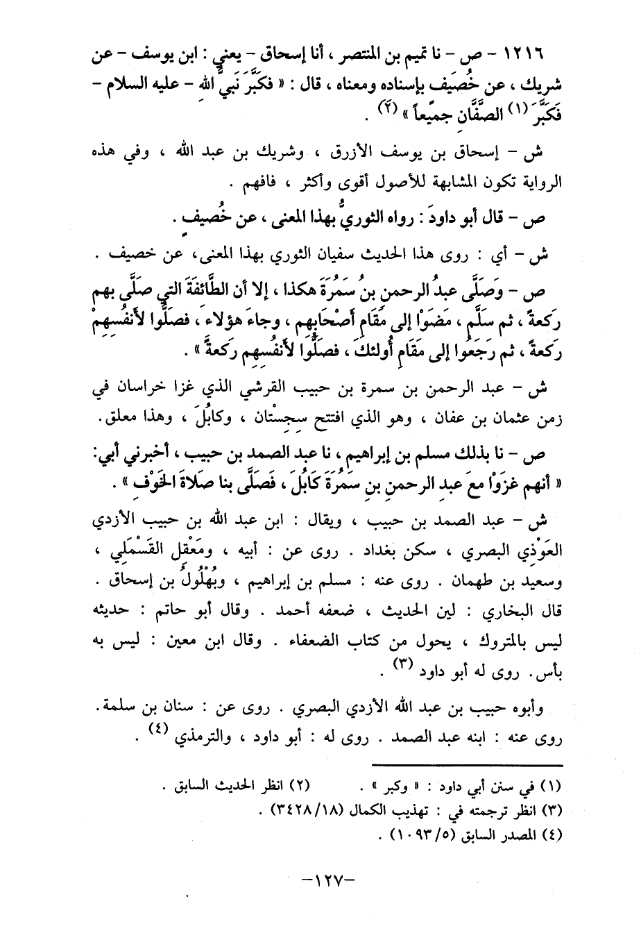 1216- ص- نا تميم بن المنتصر، أنا إسحاق- يعني: ابن يوسف- عن شريك، عن خُصَيف بإسناده ومعناه، قال: " فكَبرَ نَبي الله- عليه السلام- فَكَبَّرَ (1) الصَفانِ جميعاً " (2)