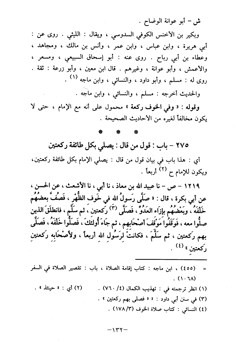 1219- ص- نا عبيد الله بن معاذ، نا أبي، نا الأشعث، عن الحسن، عن أبي بكرة، قال: نا صلى رَسولُ الله في خَوف الطهْر، فَصُف بعضُهم خَلفَهُ، وبَعْضُهُم بإزَاء العَدو، فَصلى (3) رَكعتينِ، ثم سلم، فانطلَقَ الذين صفُوا معه، فَوَقَفُواَ مَوْقَفَ أصْحَابِهِم، ثم جَاءَ أولئكَ، فَصَلُّوا خَلفَهُ، فَصَلَّى بهم رَكعتين، ثم سَلًّمَ، فكانتْ لِرَسُولِ اللهِ أربعاً ولأصْحَابِهِ ركعتين ركعتين " (4) .