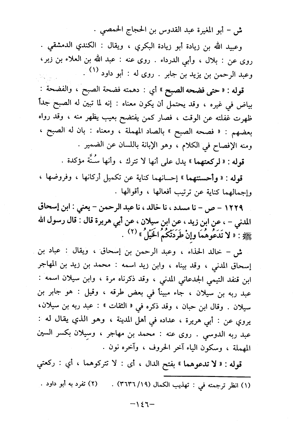 1229- ص- نا مسدد، نا خالد، نا عبد الرحمن- يعني: ابن إسحاق المدني-، عن ابن زيد، عن ابن سيلان، عن أبي هريرة قال: قال رسول الله صلى الله عليه وسلم: " لا تَدَعُوهُمَا وإنْ طَرَدَتكُمُ الَخَيْلُ " (2) .