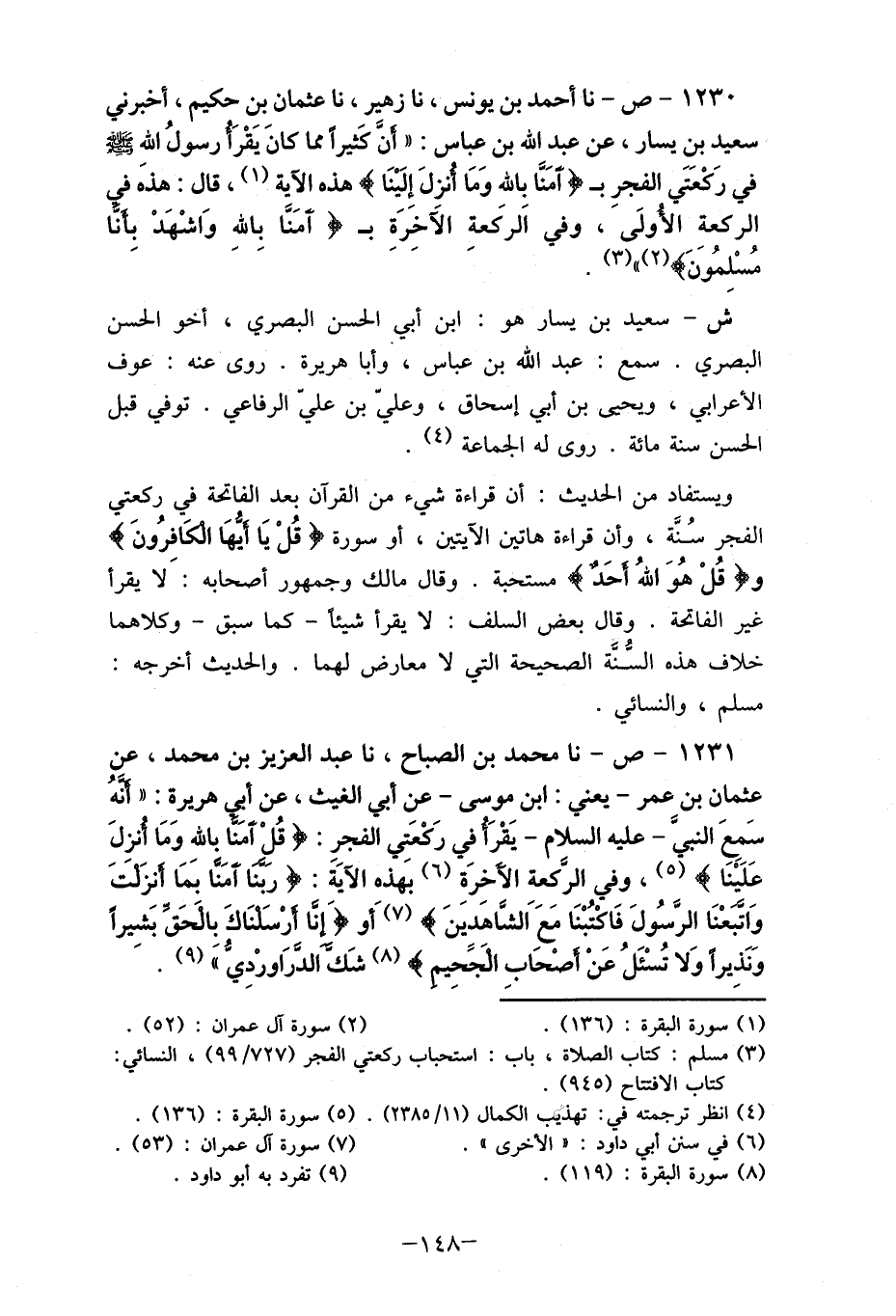 1231- ص- نا محمد بن الصباح، لا عبد العزيز بن محمد، عن عثمان بن عمر- يعني: ابن موسى- عن أبي الغيث، عن أبي هريرة: " أنه سَمعَ النبي- عليه السلام- يَقْرَأ في رَكْعَتي الفجرِ: {قُلْ آمَنا بالله وَمَا أنزلَ عَلَينَا} ، وفي الركَعة الآخِرَةِ (6) بَهذه الآية: {ربنا آمَنَّا بمَا أنزَلتً وَاتبعْنَا الرَّسُولَ فَاكْتُبْنَا مَعَ الشاهدين} (7) أَو {أنا أرْسَلنَاكَ بالحَق بَشِيراً وَنَذِيراً وَلا تُسْئَلُ عَنْ أصْحَابِ الجًحِيم} (8) شَك الدَرَاورْدِيُّ " (9) .