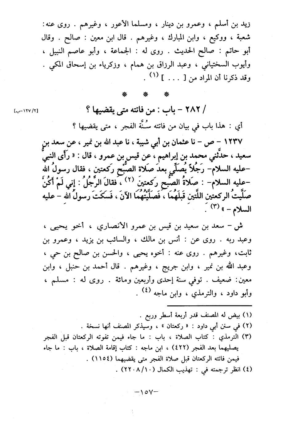 1237- ص- نا عثمان بن أبي شيبة، لا عبد الله بن نمير، عن سعد بن سعيد، حدثني محمد بن إبراهيمِ، عن قيس بن عمرو، قال: " رَأى النبيّ -عليه السلام- رجلا يُصَلّي بعد صَلاة الصُبْحِ ركعتين، فقال رسولُ الله - عليه السلام-: صَلاةُ الصبح رَكعِتينَ (2) ، فقالَ الرَّجُلُ: إني لَمْ أكُن صَليتُ الركعتين اللّتيَن قَبلَهُمَا، , فصليتهما الآن، فَسَكَتَ رسولُ الله- عليه السلام- " (3)