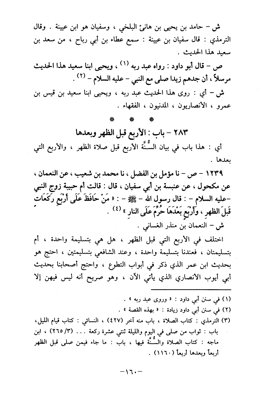 1239- ص- نا مؤمل بن الفضل، لا محمد بن شعيب، عن النعمان، عن مكحول، عن عنبسة بن أبي سفيان، قال: قالت أم حبيبة زوج النبي - عليه السلام-: قال رسول الله- صلى الله عليه وسلم -: " مَنْ حَافَظَ عَلَى أربع رَكَعَات قَبلَ الظهرِ، وَأرْبَعٍ بَعْدَهَا حُرِّمَ عَلَى النارِ " (4) .