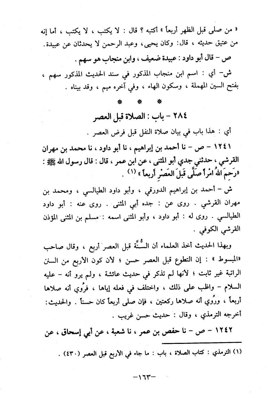 1241- ص- نا أحمد بن إبراهيم، نا أبو داود، نا محمد بن مهران القرشي، حدثنى جدي أبو المثنى، عن ابن عمر، قال: قال رسول الله صلى الله عليه وسلم " رَحِمَ الله امْرأ صِّلَى قَبلَ العَصْرِ أربعاً " (1) .