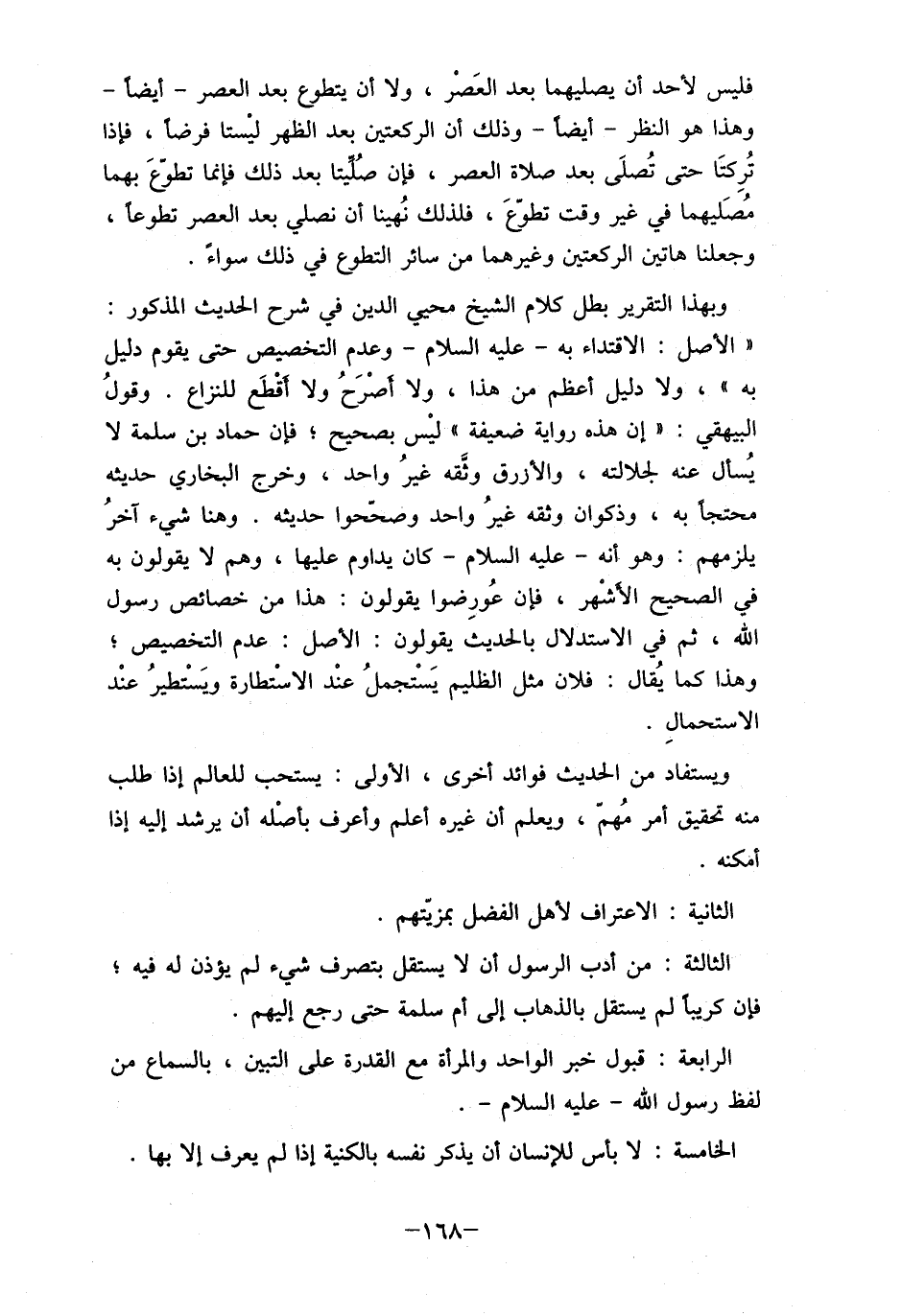 " الأصل: الاقتداء به- عليه السلام- وعدم التخصيص حتى يقوم دليل به "، ولا دليل أعظم من هذا، ولا أصْرَحُ ولا أقْطَع للنزاع. وقولُ البيهقي: " أن هذه رواية ضعيفة " ليْس بصحيح , فإن حماد بن سلمة لا يُسأل عنه لجلالته، والأزرق وثَّقه غيرُ واحد، وخرج البخاري حديثه محتجاً به، وذكوان وثقه غيرُ واحد وصحّحوا حديثه. وهنا شيء آخرُ يلزمهم: وهو حانه- عليه السلام- كان يداوم عليها، وهم لا يقولون به في الصحيح الأشْهر، فإن عُورِضوا يقولون: هذا من خصائص رسول الله، ثم في الاستدلال بالحديث يقولون: الأصل: عدم التخصيص. وهذا كما يُقال: فلان مثل الظليم يَسْتجملُ عنْد الاسْتطارة ويَسْتطيرُ عنْد الاستحمال.