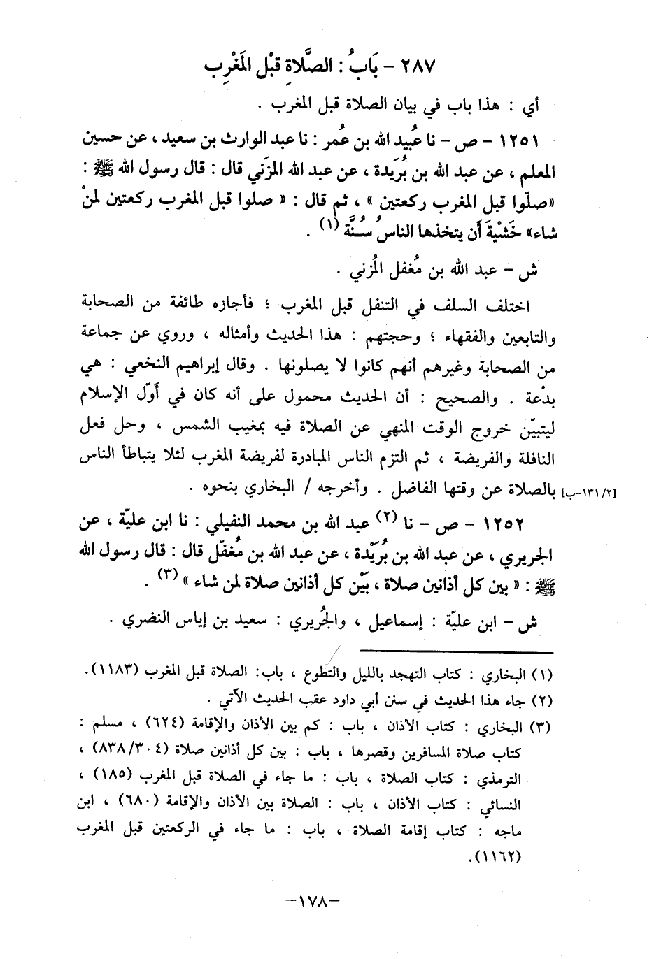 (3) البخاري: كتاب الأذان، باب: كم بين الأذان والإقامة (624) ، مسلم: كتاب صلاة المسافرين وقصرها، باب: بين كل أذانين صلاة (304 / 838) ، الترمذي: كتاب الصلاة، باب: ما جاء في الصلاة قبل المغرب (185) ، النسائي: كتاب الأذان، باب: الصلاة بين الأذان والإقامة (680) ، ابن ماجه كتاب إقامة الصلاة، باب: ما جاء في الركعتين قبل المغرب