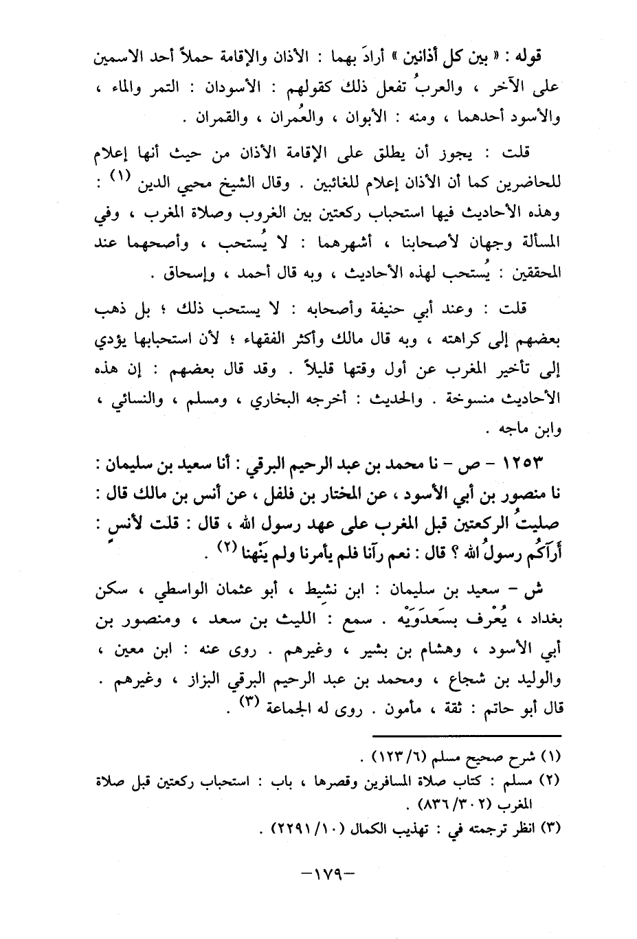 قلت: وعند أبي حنيفة وأصحابه: لا يستحب ذلك؛ بل ذهب بعضهم إلى كراهته، وبه قال مالك وكثر الفقهاء , لأن استحبابها يؤدي إلى تأخير المغرب عن أول وقتها قليلا. وقد قال بعضهم: إن هذه الأحاديث منسوخة. والحديث: أخرجه البخاري، ومسلم، والنسائي، وابن ماجه.