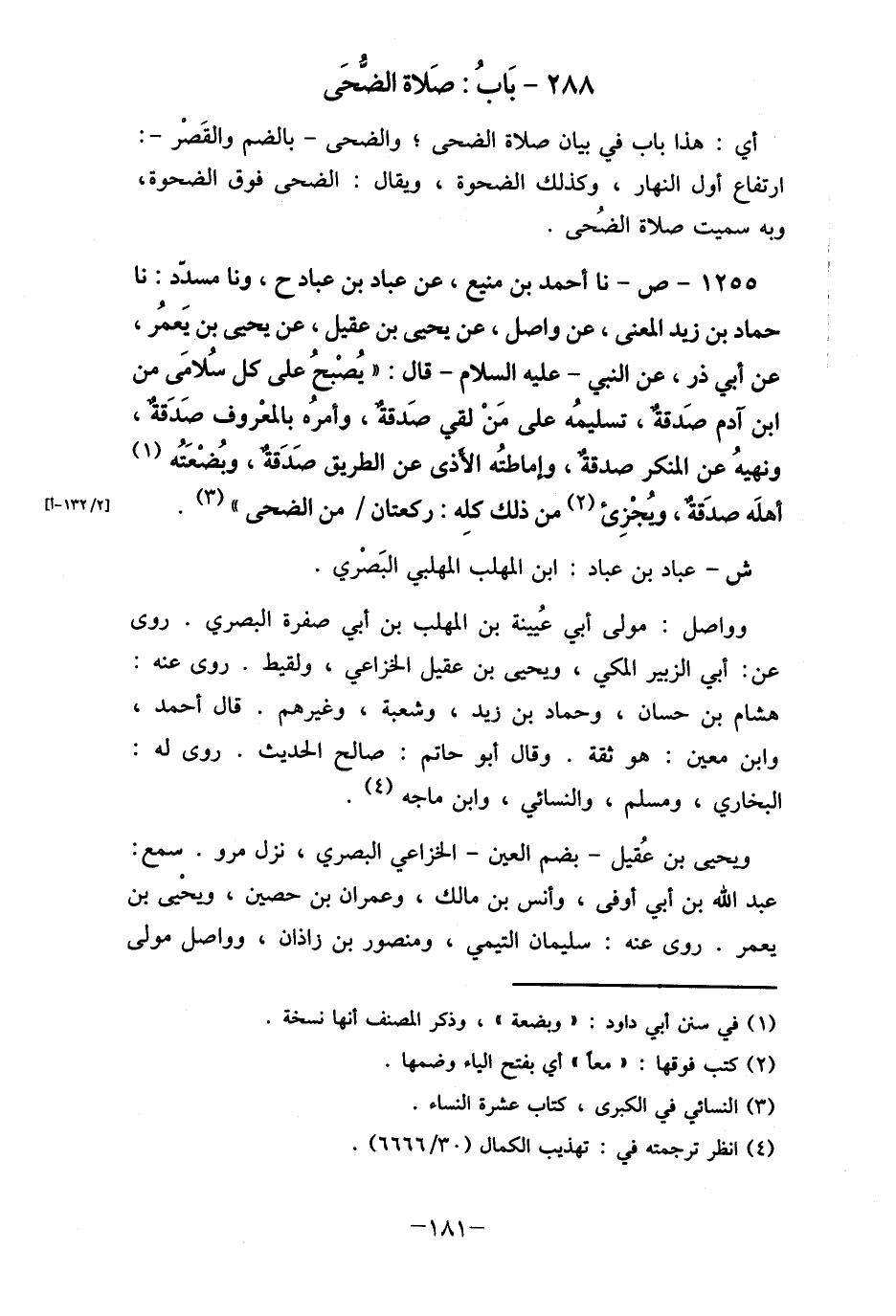 1255- ص- نا أحمد بن منيع، عن عباد بن عباد ح، ونا مسدد: نا حماد بن زيد المعنى، عن واصل، عن يحيى بن عقيل، عن يحيى بن يَعمُر، عن أبي ذر، عن النبي- عليه السلام- قال:، يُصْبحُ على كل سُلامَى من ابن آدم صَدقة، تسليمُه على مَنْ لقي صَدقة، وأمرُه بالمعْروف صَدَقة، ونهيهُ عن المنكر صدقة، وإماطتُه الأذى عن الطريق صَدَقة، وبُضْعَتُه (1) أهلَه صدَقة، ويجزئ (2) من ذلك كلِه: ركعتان/ من الضحى " (3) [2/ 132 - أ] . ش- عباد بن عباد: ابن المهلب المهلبي البَصْري.